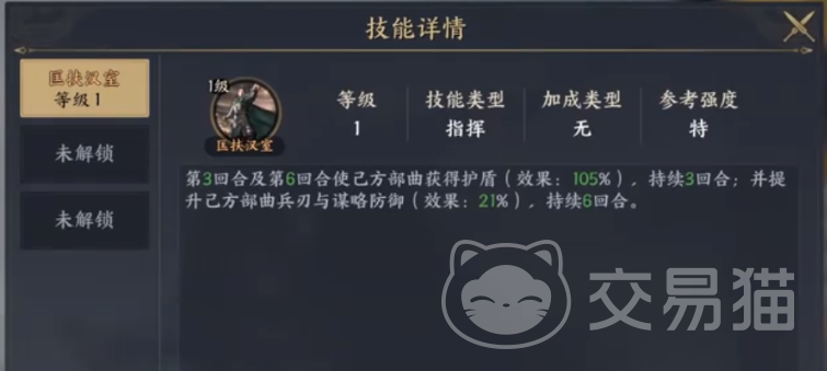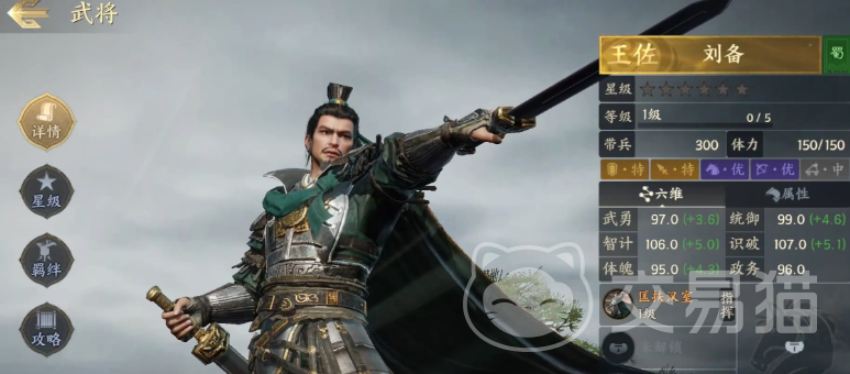 技能方面,角色主要由两个技能构成,分别为角色本身的指挥技能仁德,可以在战斗过程当中提高我方所有部队的攻击以及谋略属性。一个则是他的主动技能匡扶汉室,能够大幅度提升我方角色的生存能力。在第三回合以及第六回合是我方部队获得高额护盾效果,持续三回合并且提升我方部队的兵刃和谋略防御。