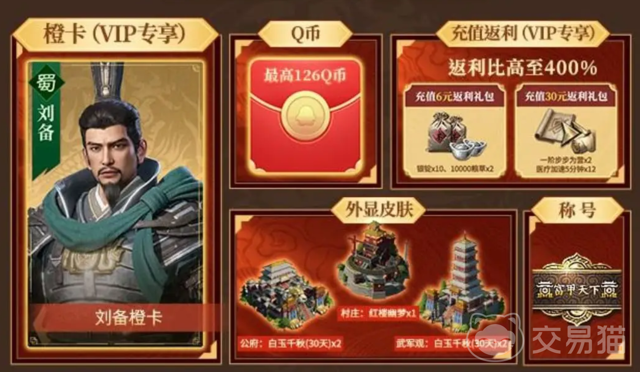 刘备作为游戏当中最高稀有度级别的角色之一,是游戏当中一张非常有用的橙卡。而且与以往的其他橙卡角色不同,玄德可以通过VIP专享橙卡礼包获得。也就是说,它属于一个强度很高,却又异常容易获得的角色。