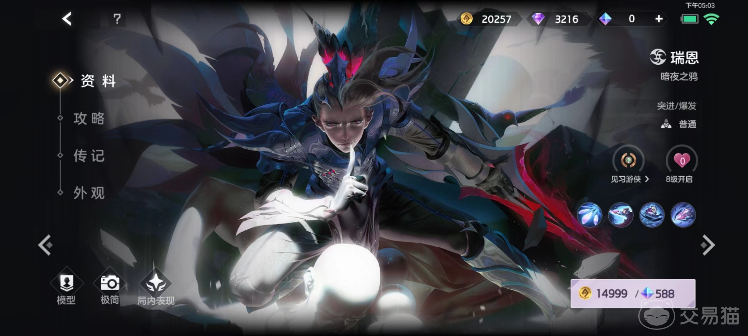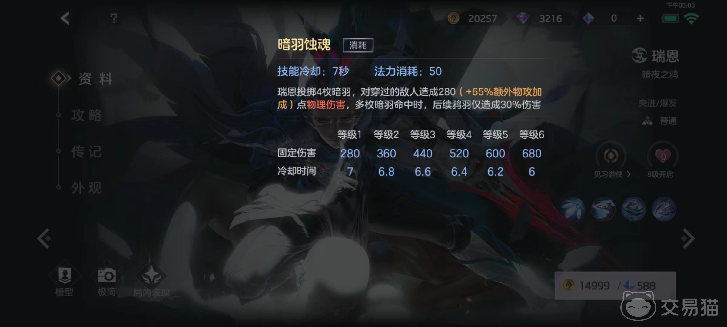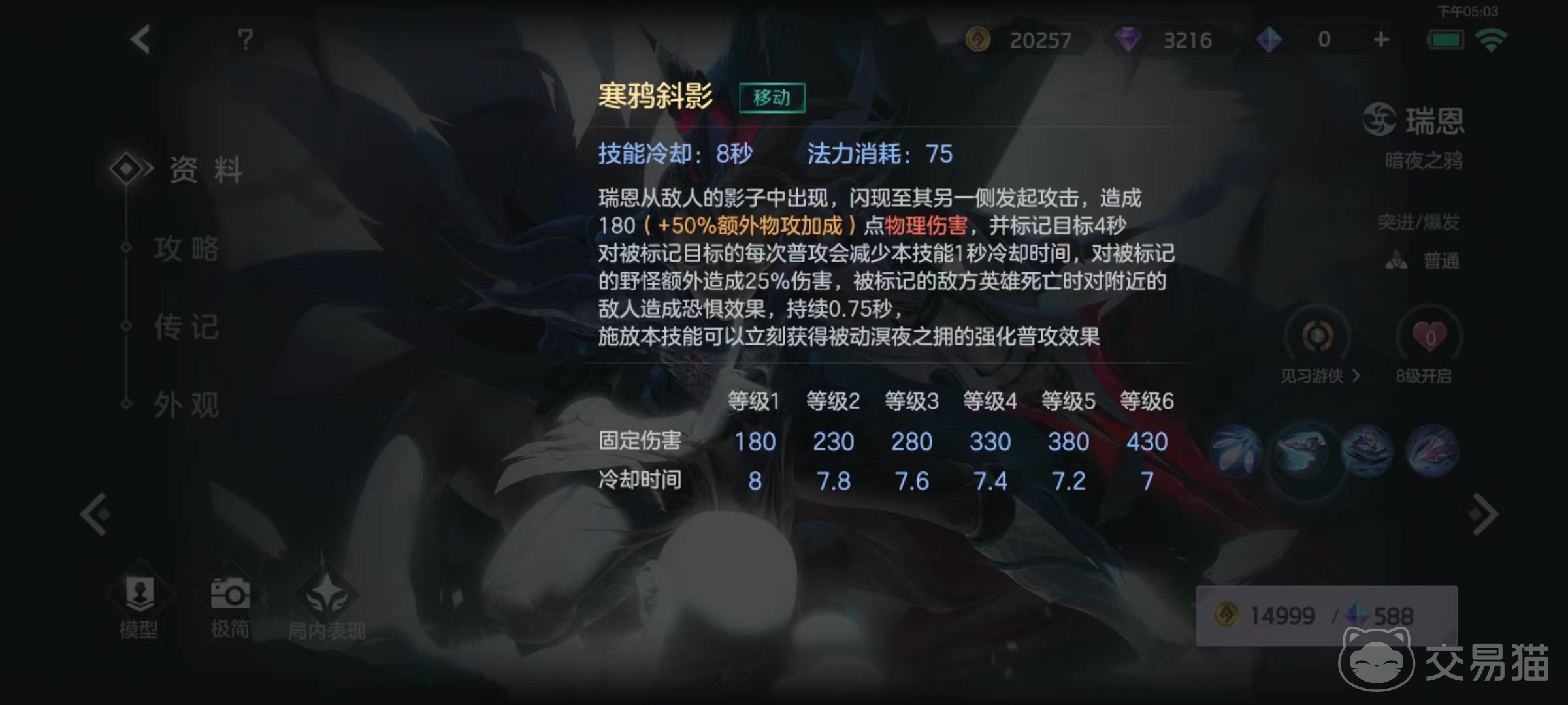 一技能投掷出四枚暗器,穿过敌人造成伤害,如果多枚命中同一目标,则后续伤害大幅衰减,简单易懂的消耗类技能,从前到后都很实用。二技能使得瑞恩从敌人影子中出现,在另一侧发动攻击并将目标标记出来,对标记目标造成普攻将会减少此技能的冷却时间。被标记英雄死亡时,还将对附近敌人造成恐惧效果。另外在开启该技能以后,将立即获得被动所拥有的强化状态。