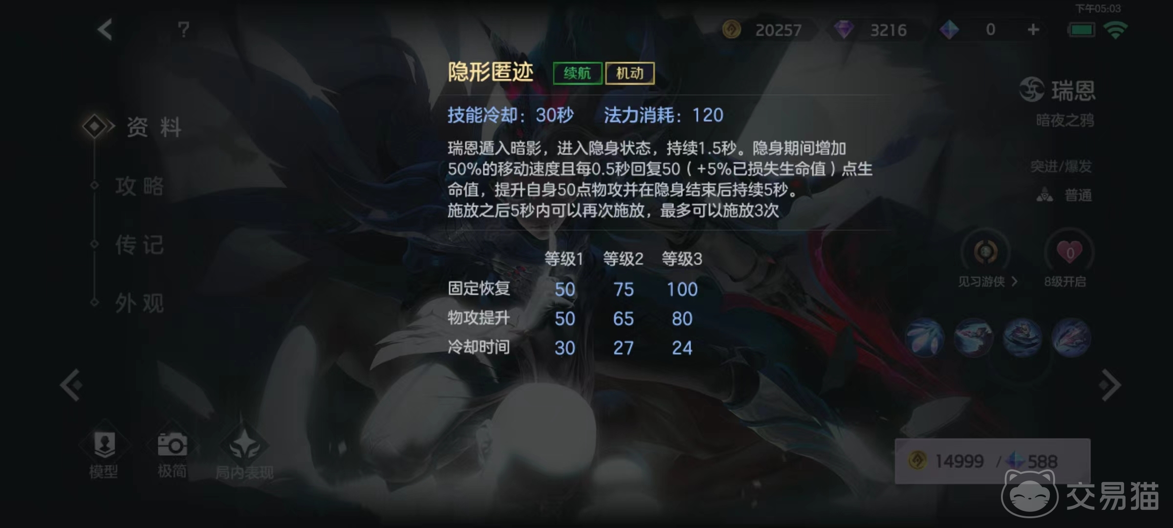三技能使用后遁入黑暗中进入隐身状态,在此期间移动速度大幅增加,并自动回复血量,提高自身物理攻击。物理攻击提升效果在隐身结束后5秒内依然生效。在实战中走的就是打野路,需要有意识的利用草丛,以及二技能和三技能刷新被动提高伤害。二技能在使用时是闪现到目标另一侧,这点要把握好。三技能躲避敌方追击时可以采用反向走位方式,这样会出其不意提高成功率。