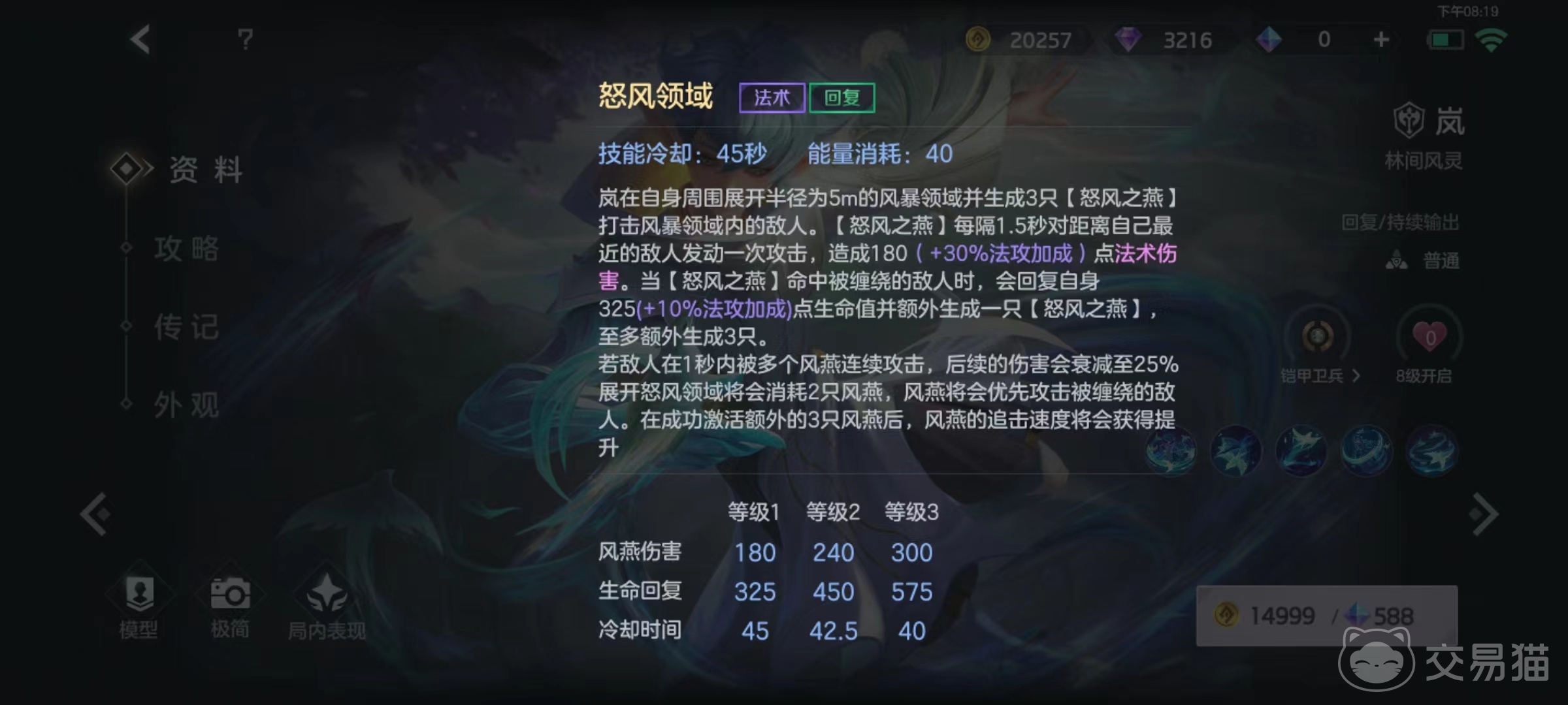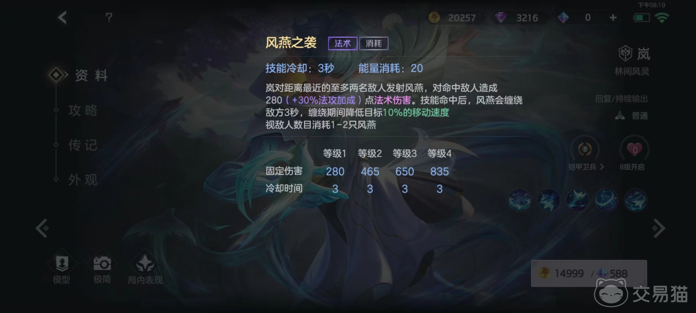 在主要技能效果方面,被动每隔三秒钟就能获得一只燕子,最多储存5只。每一只能提高1%移动速度加成,如果不考虑消耗,在5只的情况下天生就带有5%的移动速度加成,在移动力方面绝对有优势。一技能朝着距离最近两名敌人发射攻击,命中后造成法术伤害,将会缠绕对方三秒钟。在此期间降低移动速度,每攻击一名目标就会消耗一只燕子。