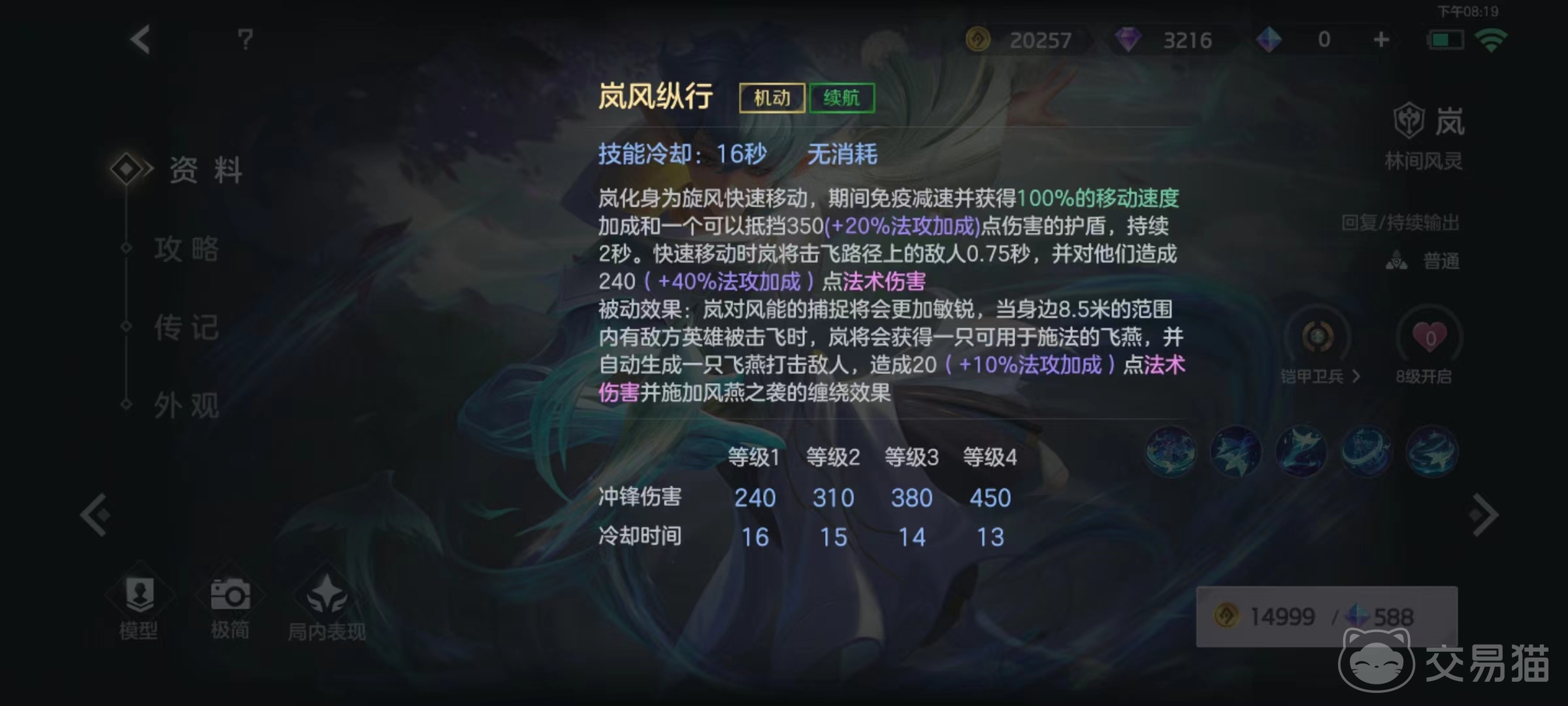 二技能可以释放出一只能够弹射的风燕,命中目标造成伤害会造成伤害衰减,如果命中目标正在被缠绕,则触发禁锢,消耗一只燕子。这样就有了较好的控制效果,但需要两个技能配合起来使用,组成一套既有伤害又有限制的小连招。三技能自身化成旋风,快速进行移动,在期间所有减速效果免疫并生成护盾。