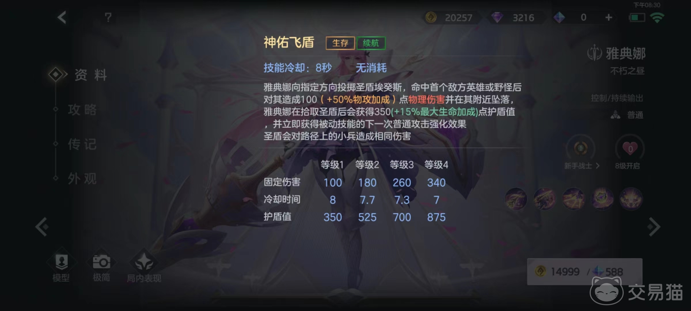 一技能是拿着长枪朝指定方向进行冲锋,减少敌方单位输出,并造成物理伤害和连续击退效果。如果在此过程中释放其他技能,可以提前终止冲锋状态。在释放结束后会往前方发动一次强势攻击,命中,后造成击退和伤害,如果此时敌人被击退至地图边缘,将会受到额外伤害和击晕。所以对该技的释放也是比较讲究技巧的,尽量在边路使用,这样可以利用墙壁实现眩晕控制。二技能对前方区域发动连续攻击,属于常规消耗技能,但施法范围比较近。三技能将手中圣盾投掷出去,命中第1个敌方英雄或是野怪后造成伤害,并在附近掉落。如果能在接下来的时间里将盾牌捡起来,雅典娜就能获得护盾并强化下一次普通攻击。