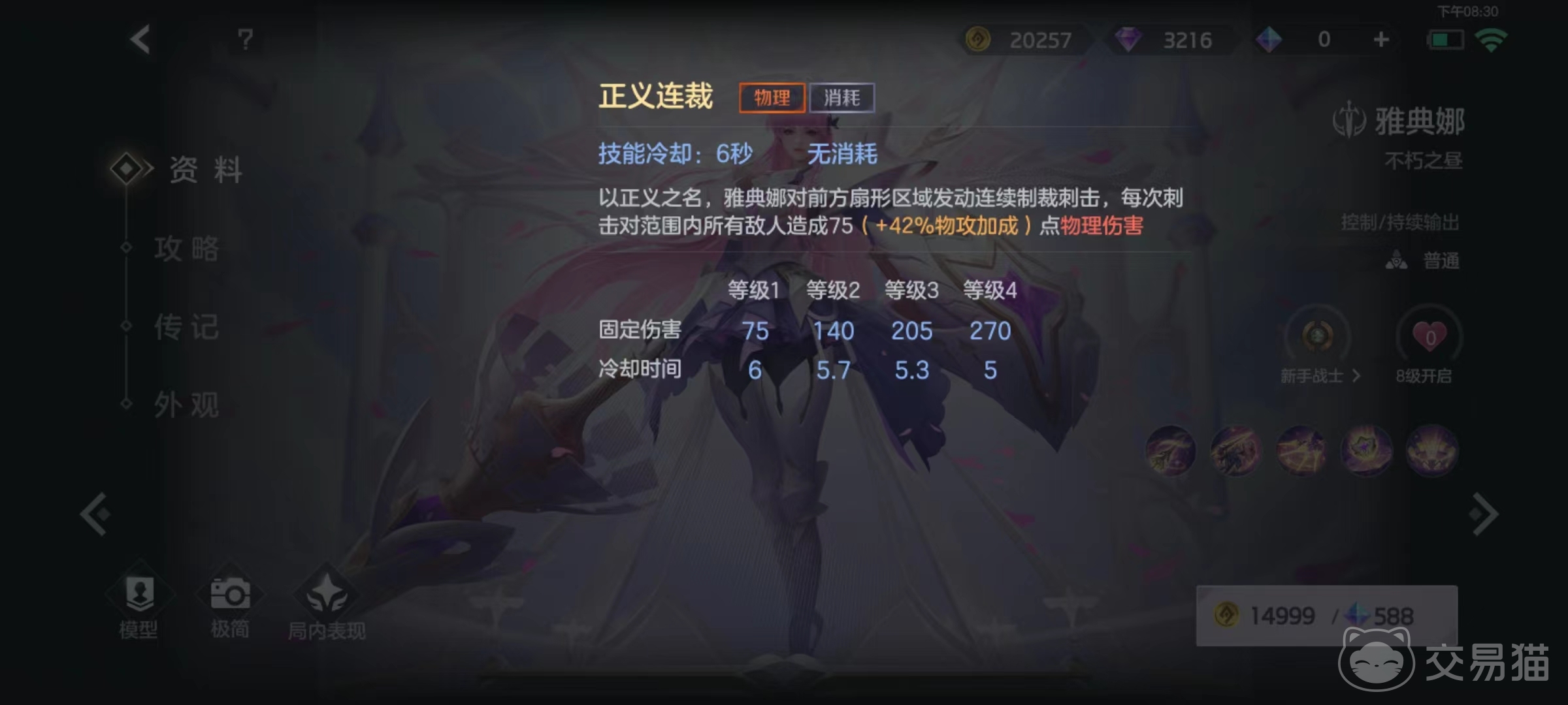 一共拥有5个不同技能。被动效果为普通攻击或者是技能命中对方英雄或野怪5次之后,将会在接下来5秒内强化下一次普攻。普攻效果变为选定目标突刺,并造成额外物理伤害,如果这一次突刺命中对方英雄或野怪,将使雅典娜回复血量并对所有命中的目标添加印记。印记持续5秒,期间对带有印记目标造成伤害越多,所有技能冷却时间减少也就越多。