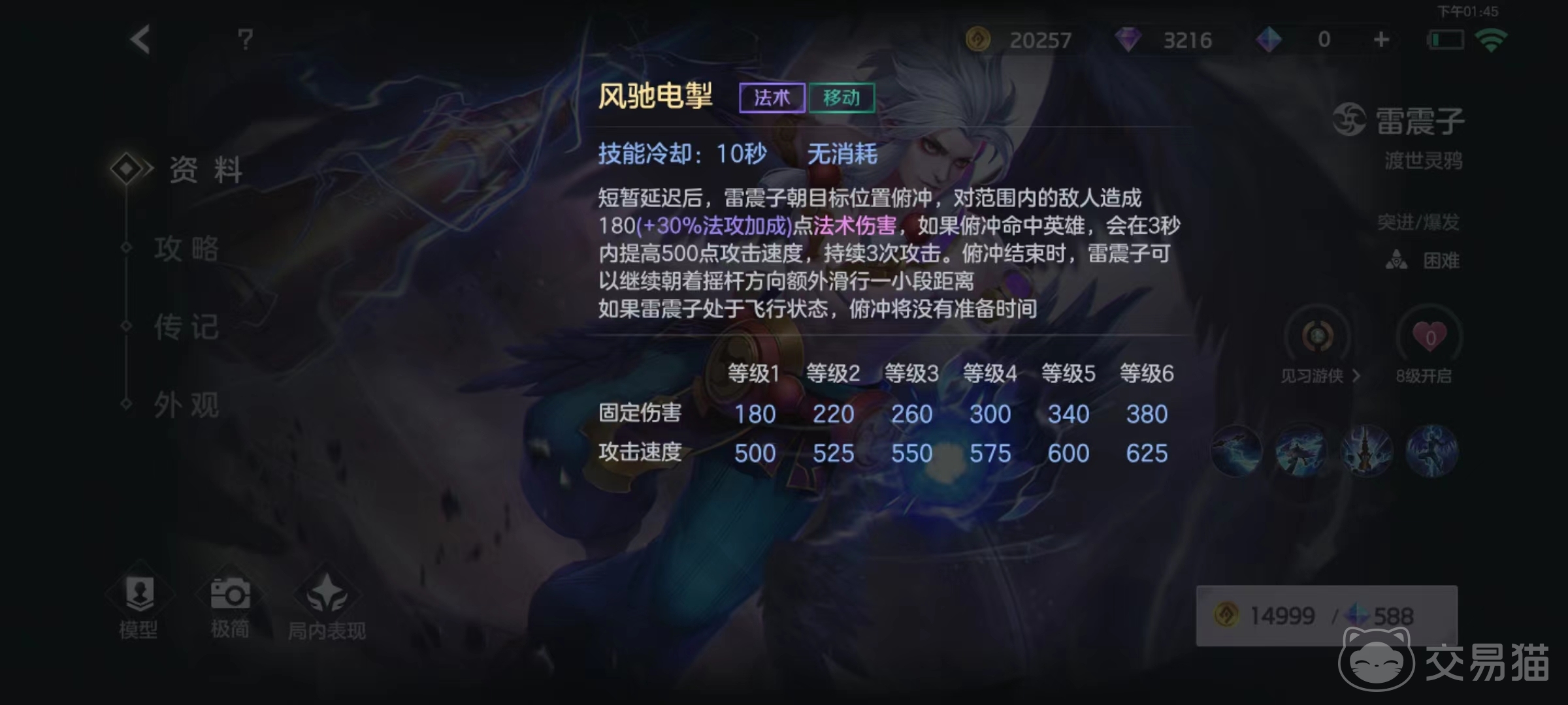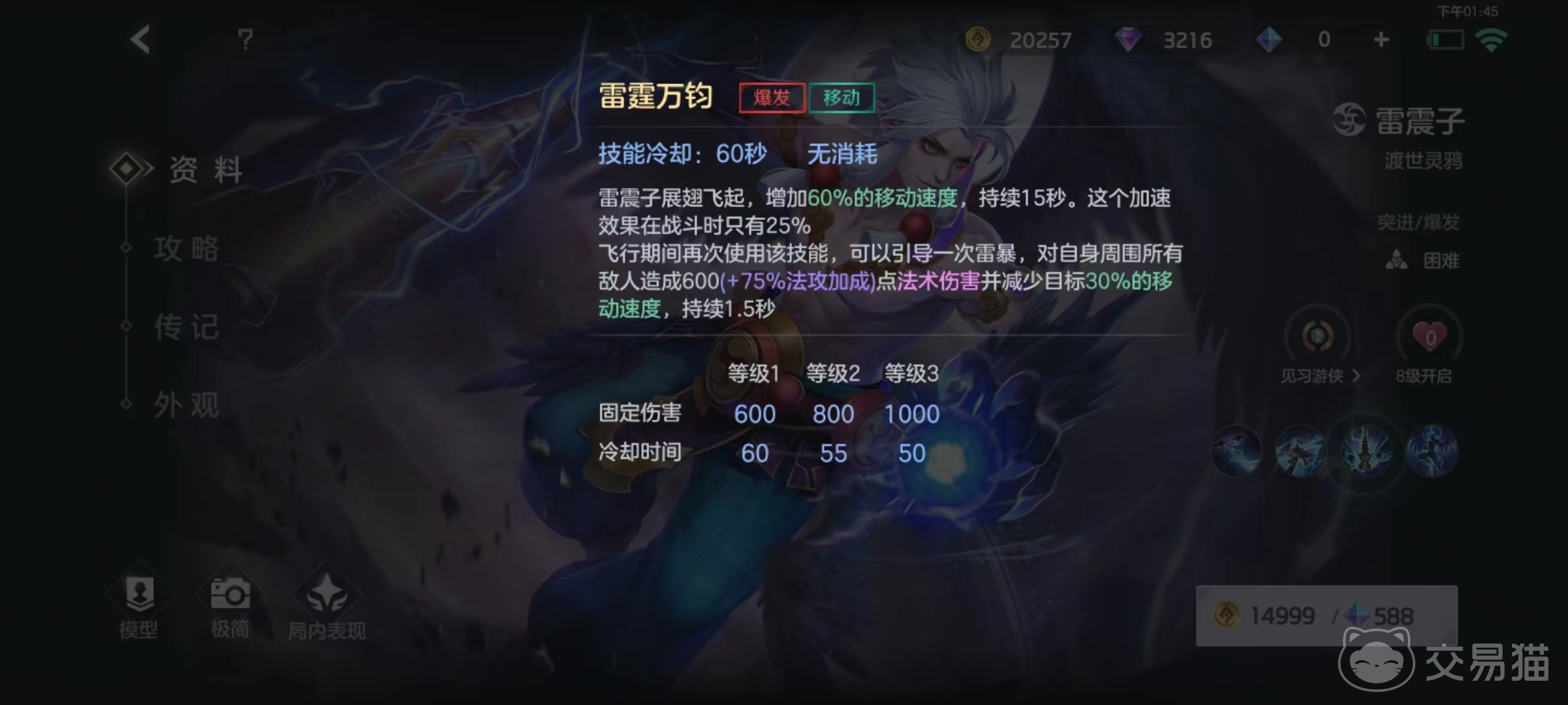 二技能需要短暂延迟后生效,朝目标位置俯冲,造成范围法术伤害,命中英雄后接下来三秒内攻击速度大幅提升,持续三次普攻。结束之后利用摇杆操纵方向可以再滑行一小段距离,如果处于飞行状态俯冲将没有准备时间。既有伤害又有位移的神技,奠定了雷震子在场上疯狂输出的基础。大招雷霆万钧,展翅飞起提升移动速度,持续15秒钟,如果处于战斗状态那么加速效果会大幅降低,飞行期间可以再次点击使用,此时将引导一次雷暴造成范围伤害。