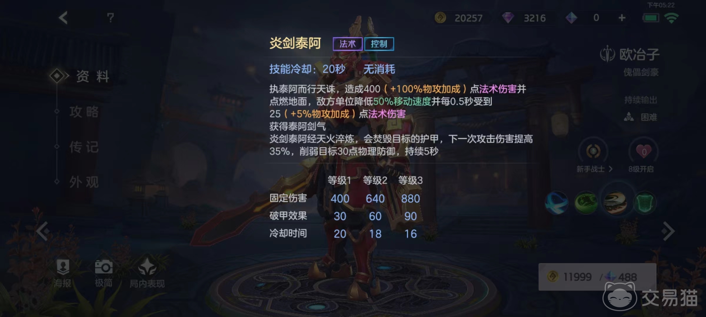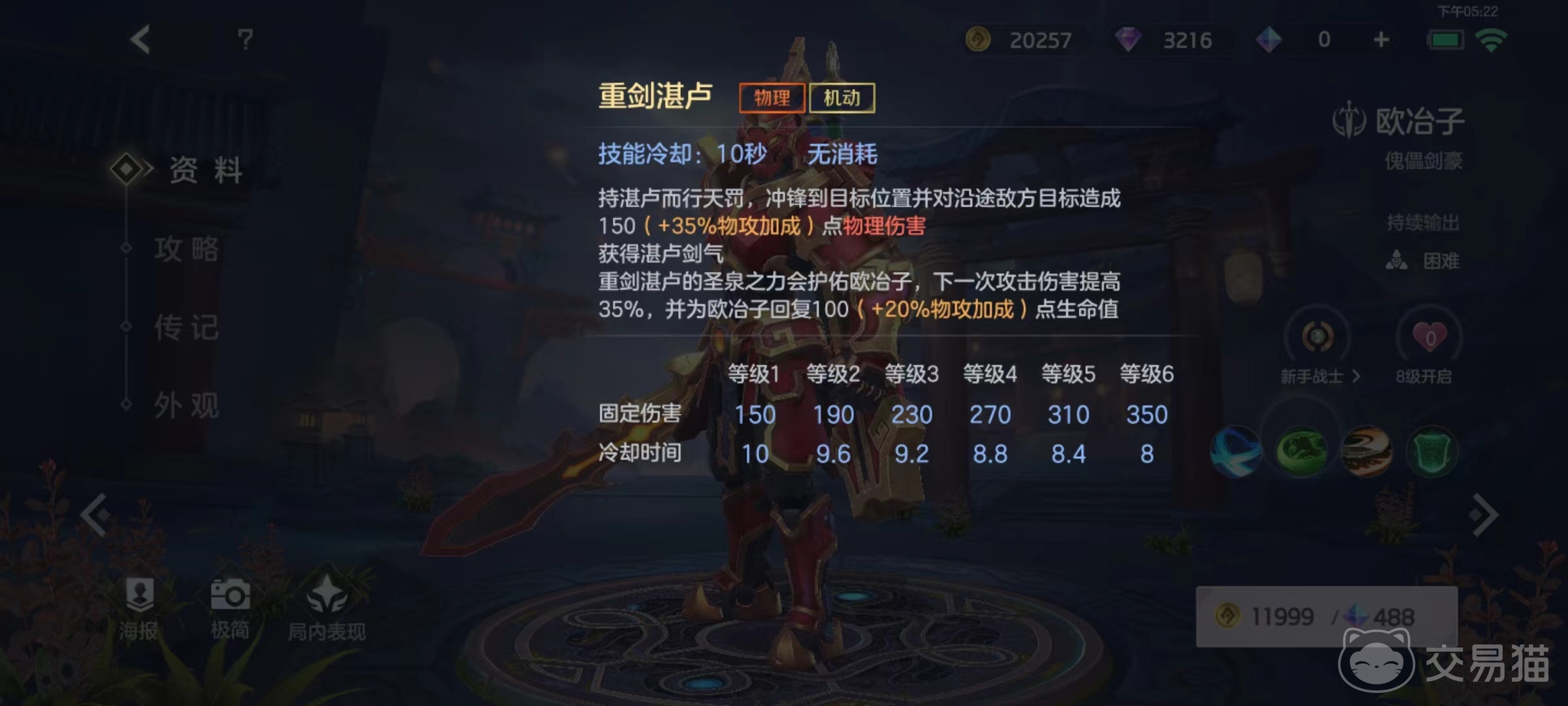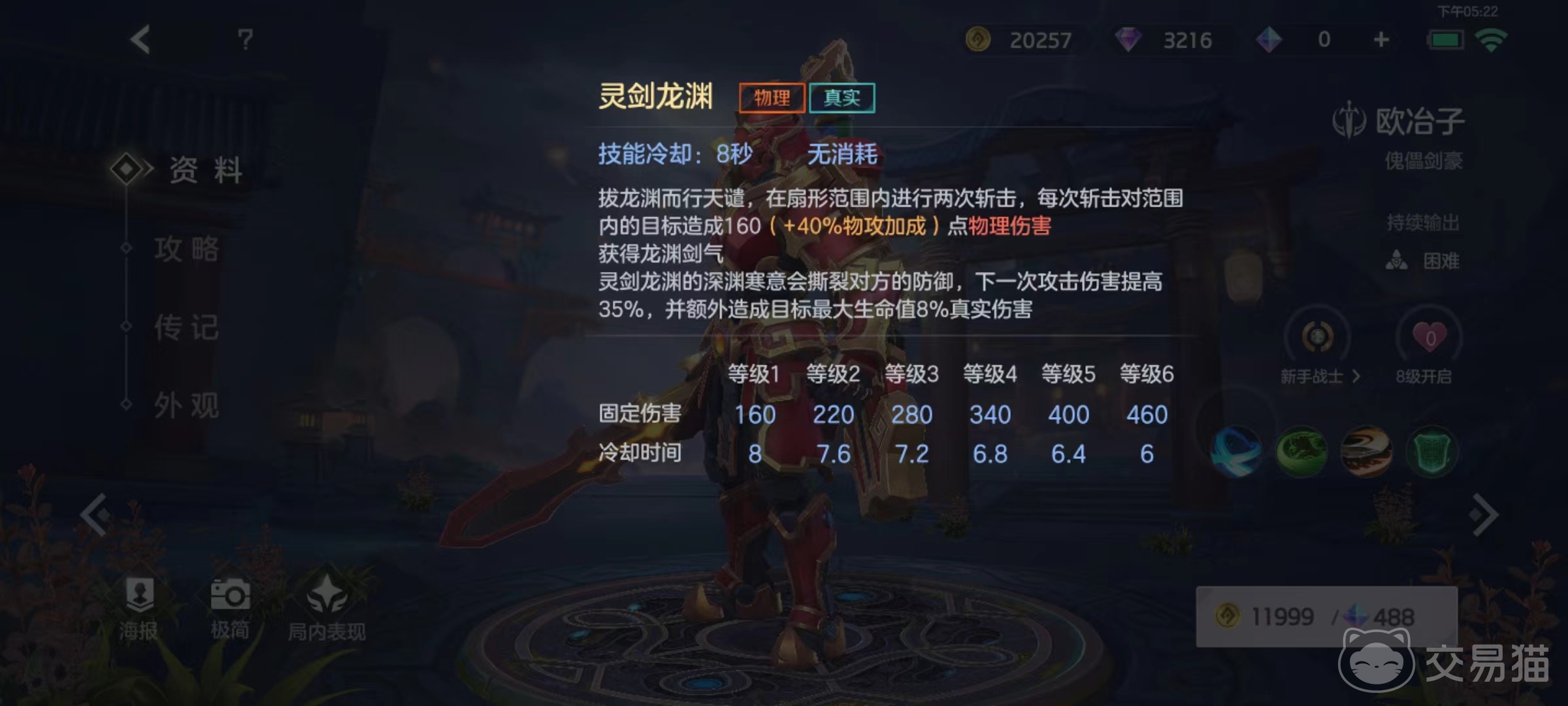 二技能切换成了湛卢剑,指定位置后冲锋并获得剑气,使得下次攻击伤害提高并恢复生命值。大招切换成泰阿剑,造成高额法术伤害并将地面点燃,所有范围内敌方单位都将降低移动速度,并持续受到伤害。获得剑气特点是能将目标护甲融化,提高下次攻击伤害并削弱物理防御。也就是欧冶子三个技能其实就是对应身上三把宝剑,这三个都是无消耗类型,大招冷却时间略长。除了本身攻击效果之外,相应剑气是很重要的属性,而且都是下一次攻击生效,这点一定要利用好,如果遇到的是对方使用欧冶子,也需要暂避锋芒等待剑气消耗掉。
