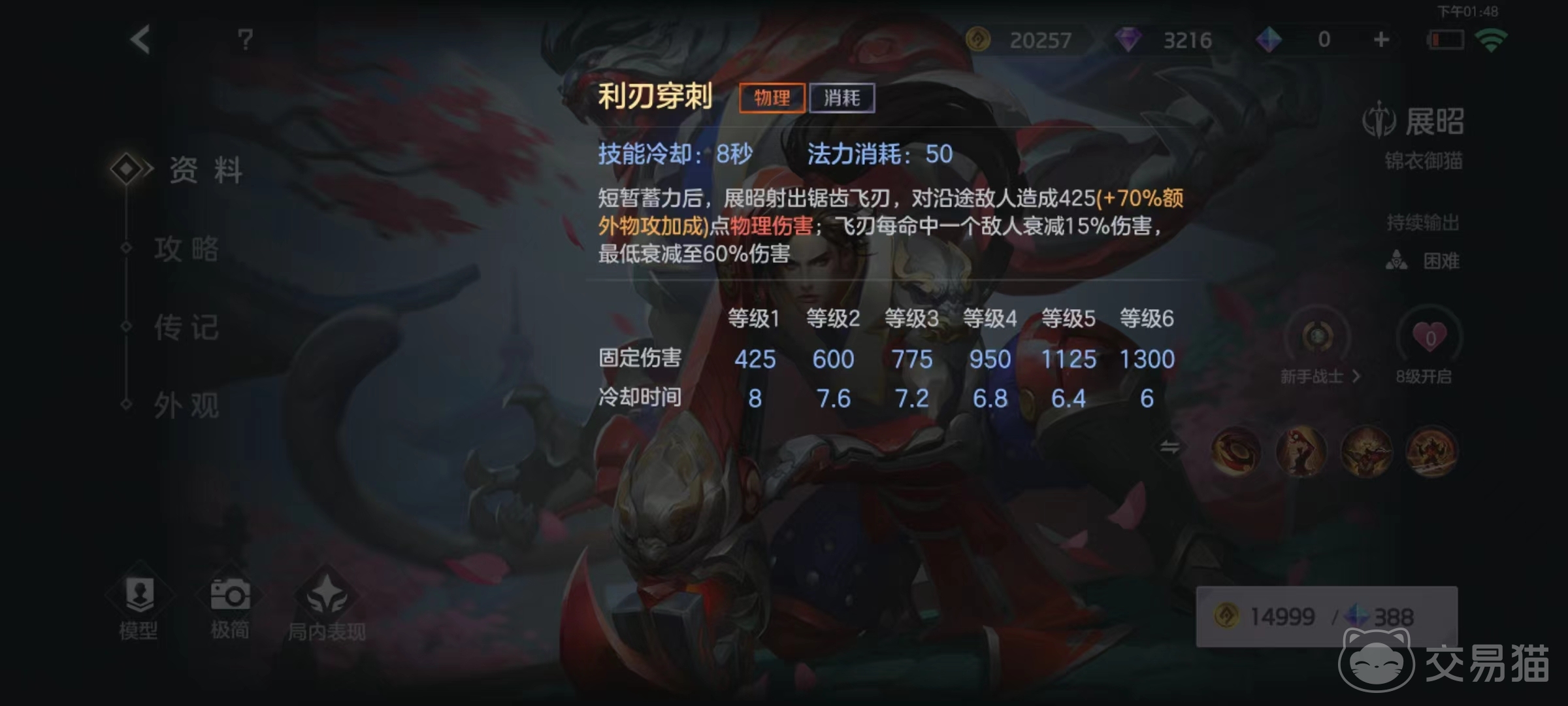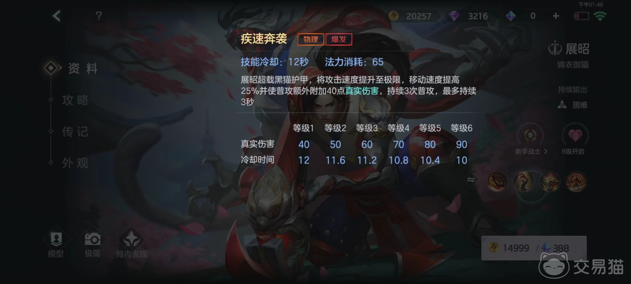 一技能和二技能将会随着形态有着效果上的不同,在常规状态下一技能蓄力发射出飞刃伤害沿途敌人,命中敌人后伤害将会衰减。二技能而将攻速提高到极限,移动速度也能获得提升,并且普攻附加额外真实伤害。变身状态下,一技能变成投掷巨石,击中后爆炸并减速。二技能变成提高移动速度,并强化下次普攻,除了伤害提升之外,还能将目标击飞。展昭这名角色是否拥有变身,对于强度影响非常大,很多新手玩家就是因为掌握不好变身时机导致丧失优势,甚至于被对方抓住破绽带走。