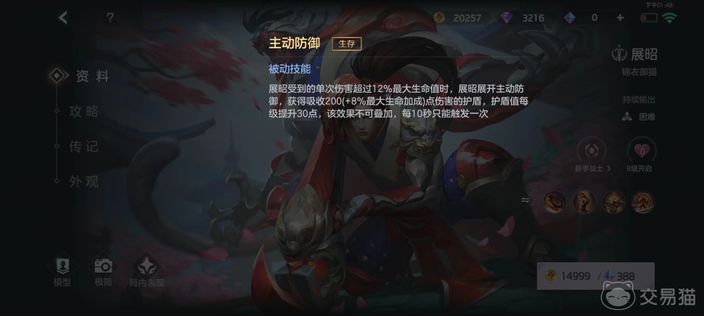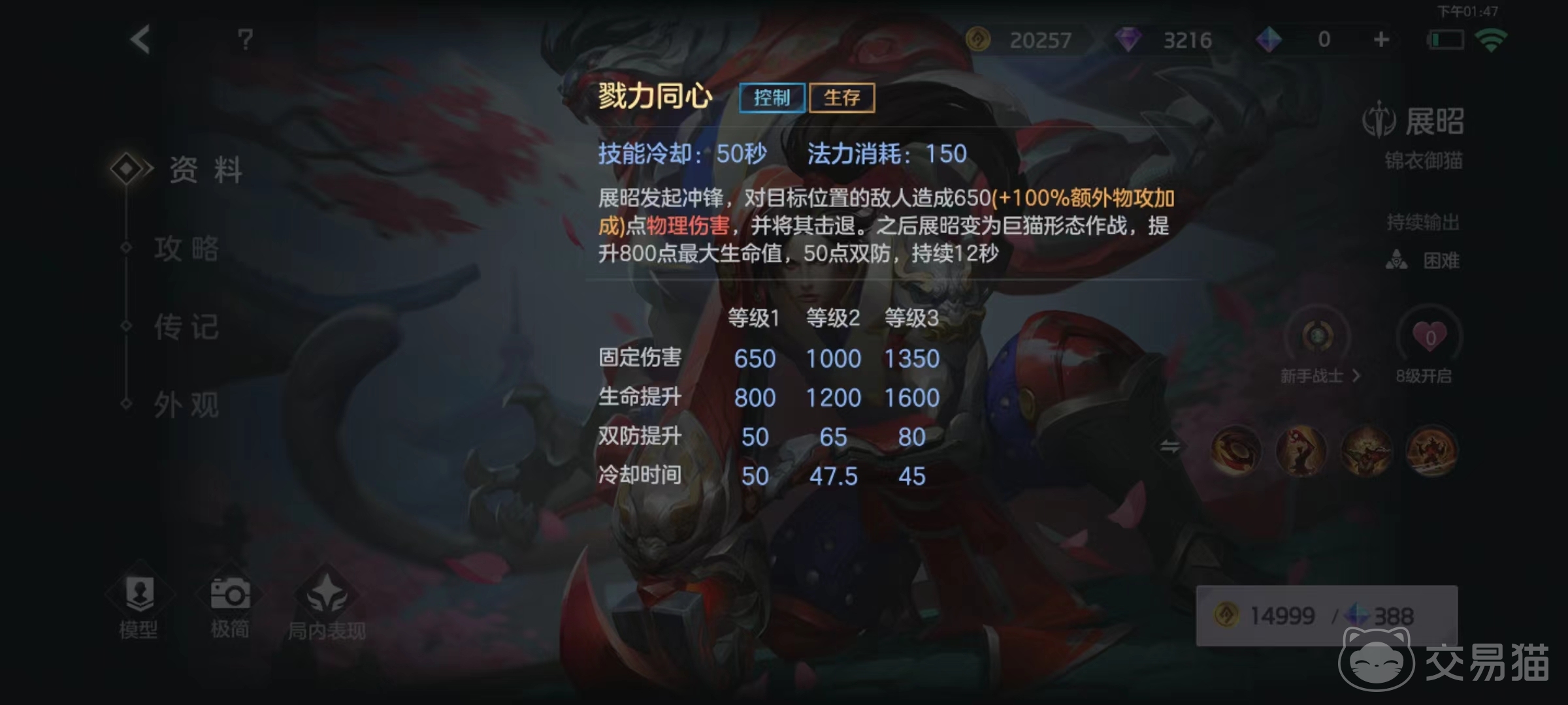 首先来简单看一下技能效果,被动为生存方向技能,每次受到的伤害如果超过12%最大生命值,就能获得主动防御效果生成护盾。通过提升等级护盾值还会增加,但不可叠加,每10秒只能触发一次。有了这一效果,想要一套技能秒掉就比较困难。大招发起冲锋,对目标位置造成伤害后将其击退,接下来会变为另一种巨猫形态作战,生命值和魔法防御以及物理防御提升,变形态持续12秒。