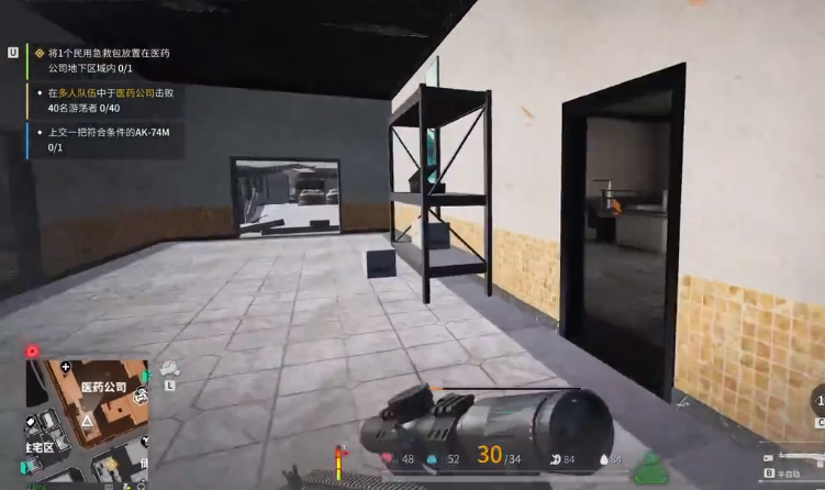 首先第一个任务点看坐下小地图位置,在医药公司这个方位的一楼,桌上会有一瓶葡萄糖,同时刷新棉签,这是一个固定刷新点。但是要注意拾取,只有拾取了桌上的物品,任务品才会重新刷新。多拾取两把葡萄糖就会刷新出面前了。