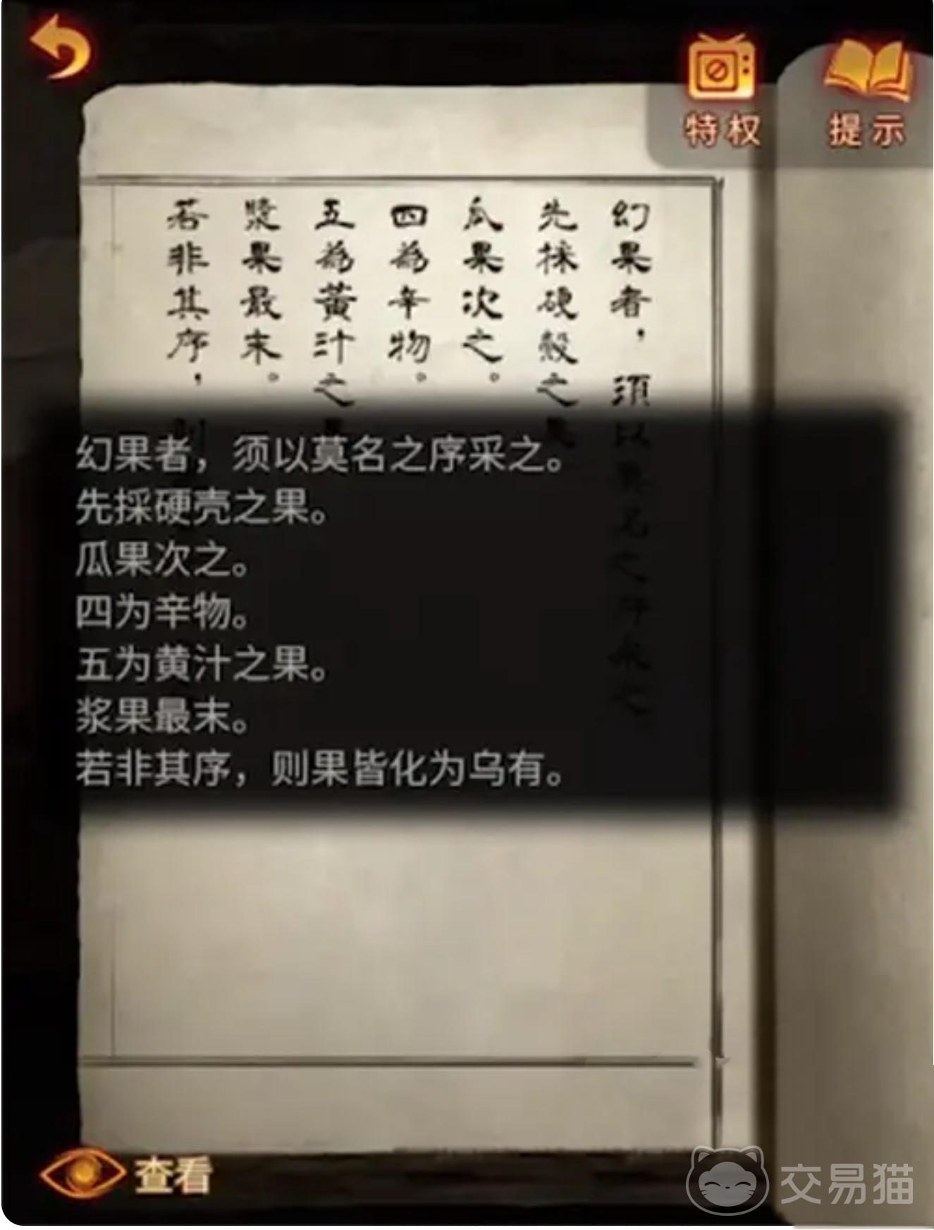 打开书籍就可以发现这个书籍当中有着非常多有关于采摘果子的小技巧,按照这些小技巧的描述玩家们就可以得出游戏当中需要采摘的顺序了,在这里书籍给出了一首诗歌,诗歌的具体内容讲的就是硬壳之果为第一 ,瓜果是第二,第三是辛辣之物,第四则是黄汁的水果,最后一个就是浆果,玩家们只需要将线索当中所提到的顺序和物品依次对应到水果当中,就可以轻松得到它们具体的排列顺序了。