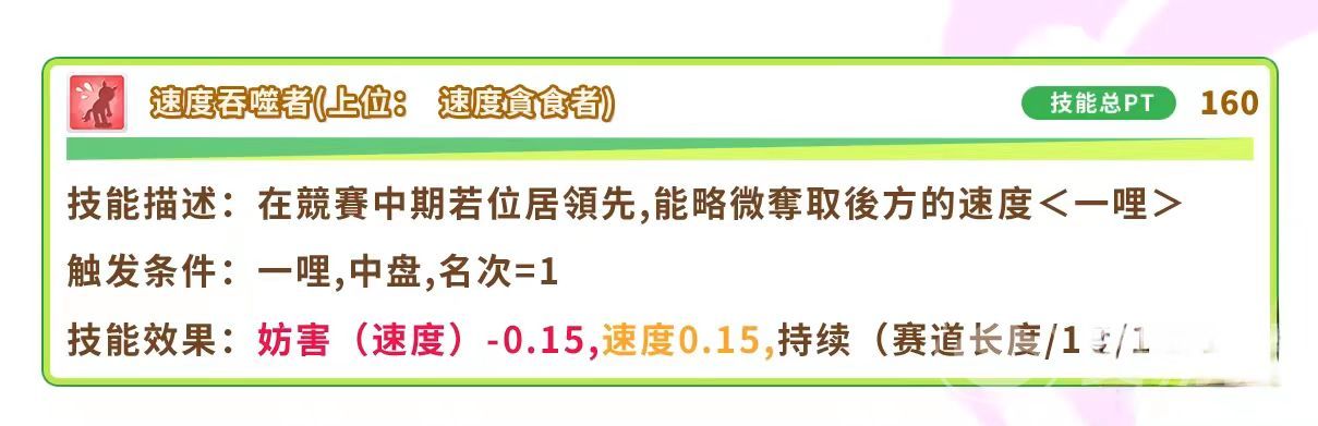 第二个技能就是放在比赛中期时使用了。这里跟上面的一个技能相反,这里的玩家们如果一直处在领头羊的地位,那么还可以对落在后方的赛马娘的速度进行夺取,拖延他们的速度,将身位拉得更开,也是一个十分强悍的技能,但同样的这个技能也是只有在特定的场景和时期使用,比如说它就只能在英里赛的中期才可以进行发动,条件还必须是玩家们奔跑在前几名的位置。