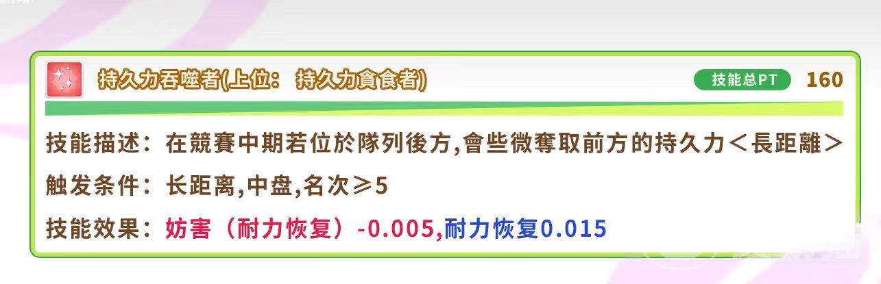 而本期为玩家们介绍了两个比较特殊的闸马技能,因为这两个技能是随身携带着增益效果的,第一个技能是玩家们在参与比赛的后期时,如果落后,那么这一技能就会触发,夺取奔跑在玩家们前方赛马娘的持久力,然后回馈到自己身上,当然要注意的一点是,这一个道具只能够在参加长距离作战时使用。