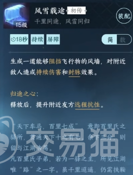 逆水寒手游风墙技能其实叫【风雪载途】,这个技能需要18秒的冷却时间,技能开启后可以在指定方向释放出一个可以阻挡飞行物的风墙,对附加的敌人会造成持续伤害和风脉效果,非常的好用,在舞阳城大黑尊使者的时候有着很大的作用!