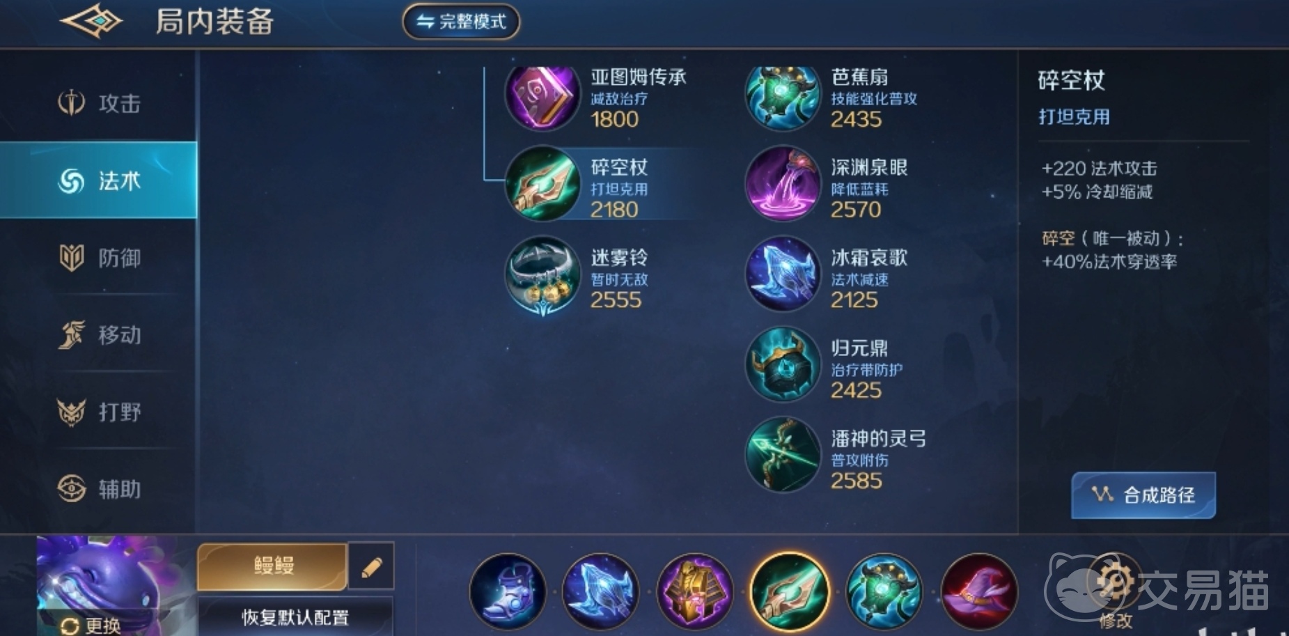 第二套推荐的出装是:镜光法典+风暴之翼+恶念+迷雾铃+碧蓝怒火+降魔宝珠,这一出装对于鳗鳗游走的强化是比较有益的,在对战中想要玩游走的小伙伴,就可以选择这一套出装,而且搭配为这样的出装后,鳗鳗的推线能力又有一定的提升了哟~