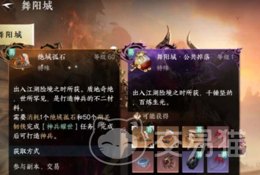 如果玩家想要发神兵耀世,那玩家首先就需要获得绝域孤石,绝域孤石可以选择去舞阳城获取,因为在这里有非常高的掉落几率,假如没能在游戏中获得,那也可以直接在交易中心选择购买,一旦得到了绝域孤石,人家就可以在游戏中领取神兵耀世,领取完这个任务之后就可以找铁匠打造最强的橙色装备,可以在游戏中所向披靡。