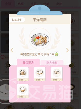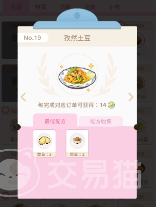 第三个是孜然土豆,这个食谱的配方里面必须要有孜然跟土豆,第三个食材大家可以在胡萝卜、青菜、青椒跟辣椒里面选择,这几个都是不会影响最后菜品产出的,也是前期比较容易获取的食材。