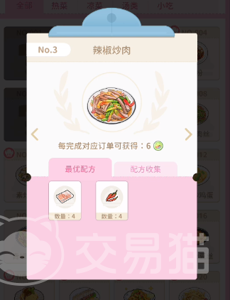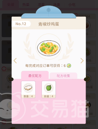 第二个是青椒炒鸡蛋,上面的两个主要食材是不能改变的,也就是说青椒跟鸡蛋必须在配方里面,第三个食材大家可以换成耗油、鸡肉或者是洋葱也可以,如果放的第三个食材是青菜也会出青椒炒蛋,所以这个菜肴的成功率是比较高的。