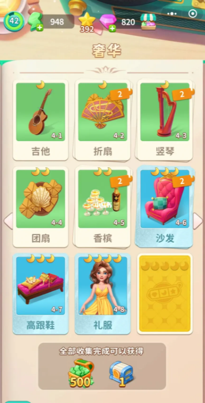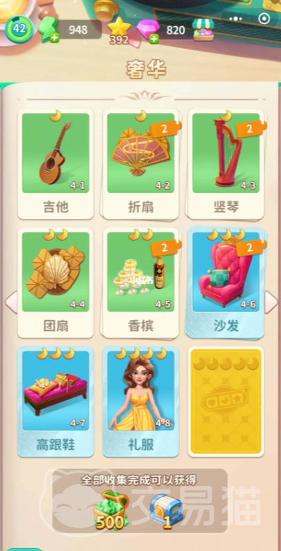 其中,奢华房间则是需要我们,拥有吉他折扇,竖琴,团扇,香槟,沙发,高跟鞋,加礼服,等等相应的素材才能够解锁。只要将我们的各类型素材全部解锁之后,即可以获得。