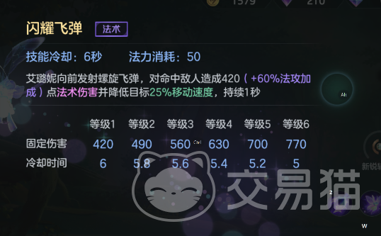 闪耀飞弹:主要伤害技能,低冷却低消耗,释放一个飞弹对前方的敌人造成减速效果!