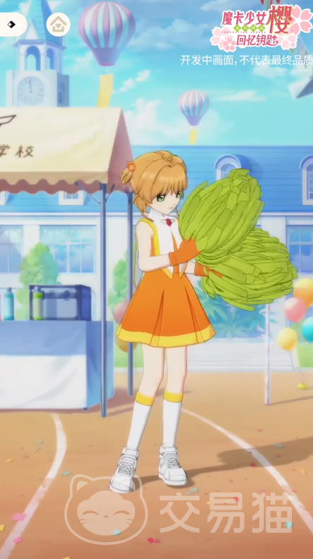 第二套是青春活力的拉拉队服,这一套服装整体呈现的是黄绿色,裙子造型上面借鉴了一点运动风,橙黄色百褶裙很适合运动场,裙子上方则是做了一个中式立领,亮点是手上拿着的两个花球,颜色是绿色的跟足球场运动的风格很相配,因为体积比加大,所以一眼看过来就会先关注这两个拉拉球球,脚上从公主鞋换成了白色运动鞋,还有白色的长袜做出来的运动造型,让人一看就知道是啦啦队的造型,