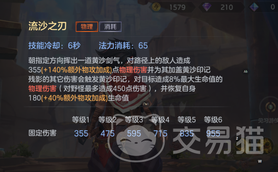 流沙之刃:可以对前方敌人释放一个剑气,被击中的敌人都会被附上一层印记,这个技能可以和被动技能很好的联动在一起,触发印记效果后自身还会回复生命值!