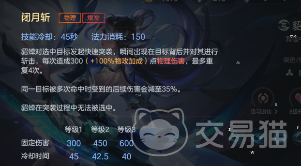 闭月斩:高爆发伤害技能,对选中的敌人进行多段伤害,同时可以快速瞬移到目标身边,但是四次伤害会被慢慢削减,在攻击的同时也是没有办法兑貂蝉进行选择的!