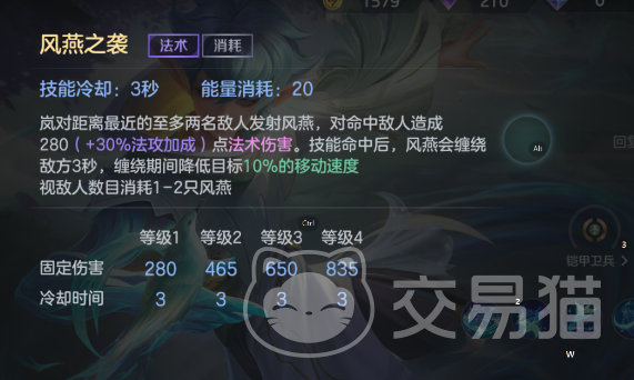 风燕之袭:可以对前方多个目标释放出飞燕,飞燕会对敌人造成伤害后继续对敌人进行缠绕,期间敌人会受到减速效果,但是会消耗掉自身储存的飞燕!
