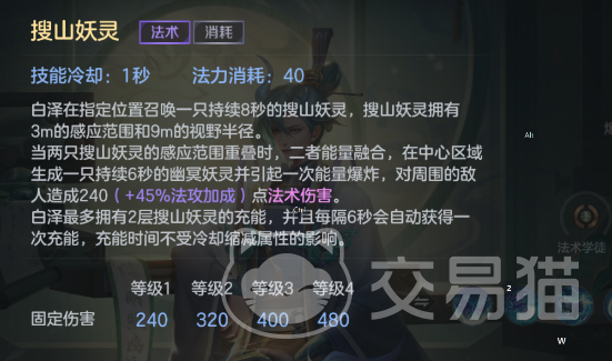 搜山妖灵:可以召唤出一个山妖,山妖可以帮助白泽探索更广阔的视野,而且这个技能冷却时间只需要1秒,同时这个技能可以充能两次,当两个山妖同时在场的时候,两者会进行合体,对附近的敌人造成高额的法术伤害!