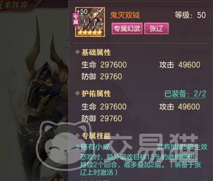 最后是他的大招也就是怒气技能,叫做风影逍遥刺,该技能发动之后他会攻击敌方纵排的所有敌人,会对这些敌人进行连续的刺击,之后在刺击期间纵排的所有敌人都会受到高额的伤害,这个伤害量相当于他攻击力的160%,就这个160%的攻击伤害可以说绝大多数人是吃不下的,除非有减伤。就这么看下来,光看技能和属性面板的话,张辽是绝对可以称的上强的,但是还没结束。