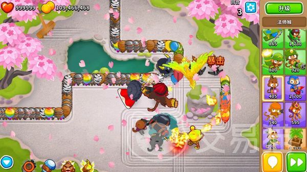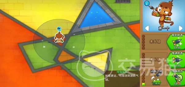 特别是回旋镖猴,大家将它的上路全部点满的话,它自身还会有三个黑色的回旋镖围绕着角色,这样在战斗中只要有气球靠近角色的话,那么它就会自动被打爆啦,能够解决不少问题。