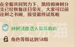 等到了不卡进度的时候,大家就可以开始下一步了,这一步就是需要让神树的进度提升到复苏阶段,在游戏中大家想要神树进入到复苏阶段是需要花费很多精力的,这主要是因为神树的复苏进度和能量有关,而这个能力每天的获取量是有上限的。因为有这个上限的存在,大家在进行神树复苏的时候每天的进度都会很慢,具体来说,大家想要拉满神树进度的话,最起码要攒一个多星期的神树能量才够。而在完成了这一步后,就来到了第三个步骤了。