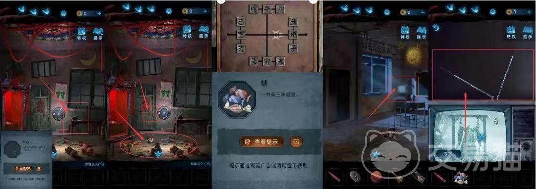 然后紧跟着来到墙边桌子角落上的香炉旁,从香炉当中会获得道具铁条,同时地上还会有着十二生肖的玩具,点击它们再点击绿色的锁,然后将玩具的位置调整一下,整理好后玩家们就可以获得道具糖,做完这些再一次回到教室,就可以点击教室当中黑暗的电视了,再把刚才所获得的道具铁条当成天线,就可以把电视打开了。