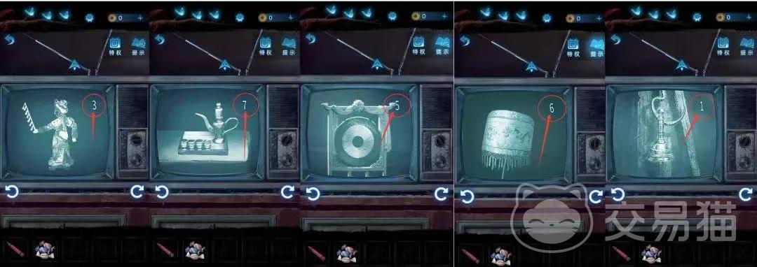 打开电视之后,再按照笔记上面所说的数字顺序调整一下电视台,先点左边按逆时针把按钮调到皮影状态,再点右边的顺时针调到酒杯状态,点击逆时针调到锣的状态,顺时针调到华盖状态,逆时针调到铃铛状态,做完这些之后可以得出一个线索数字是37561,将这个数字获得之后就可以把铁线拿下来了。