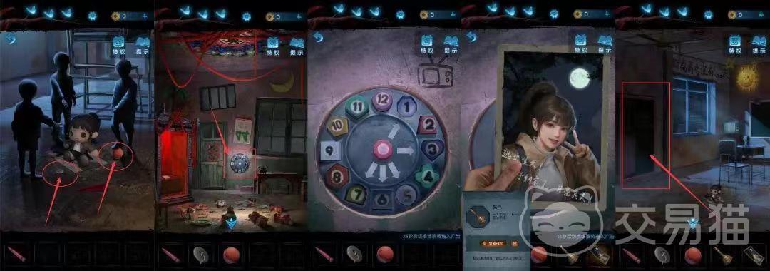 再然后把刚才获得的糖果给小孩,从小孩身上获得皮球和纽扣这两个道具,重新回到在树洞当中的房间,会发现门边有一个圆盘,再把刚才得到的数字点击到圆盘当中,额外获得照片和铃铛的道具,这是再回到一开始的教室,进入到最左侧的黑漆漆的房间。