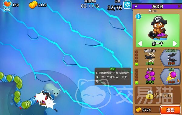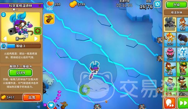 然后大概达到17回合的时候再去中间位置放一个科学家格温德林,它可以在战斗中每隔几秒发挥强大的火焰,爆炸波对气球产生强力的冲击效果,并且将附近的猴子攻击力得到提升效果。