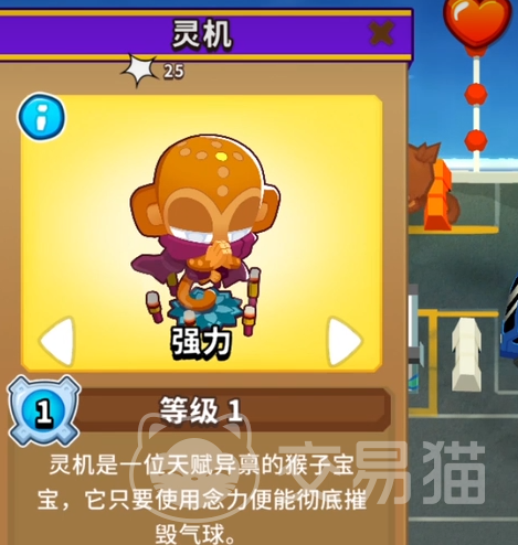 灵机其实既不是道具,也不是技能,它是一种类型的猴子。它的背景介绍是灵机是一位天赋异禀的猴子宝宝,它主要的输出方式便是使用念力进行攻击,它可以使气球本身发生震荡,在震荡过后便可以打破气球,但是相比于普通攻击,这种攻击对于打破气球是更加有效。