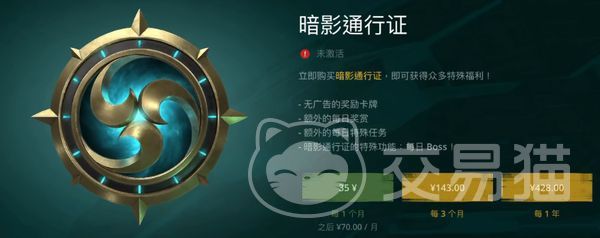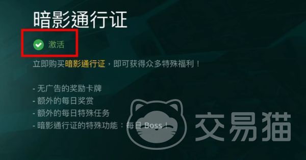 这边是比较推荐大家去购买一下暗影通行证的,因为它在游戏中主要有四个重要效果,第一无广告奖励卡牌,单单这一条就非常让人心动,可以让大家在游戏中体验的时候免广告,等有合适的机会可以直接写脚本投降,这个游戏中经常会出现一些比较优质的活动,如果购买通行证的话就可以让大家在打活动场的时候奖励卡牌能够获取到更高级的,只要搭配连点器,就基本上可以一波肥了。