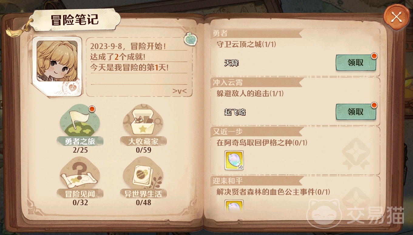 旅途可以通过点击右边的四叶草图标进入,进入对应的页面后可以看到三个玩法板块,第一个就是冒险笔记,它会记录你的冒险天数,同时还会记录四种方向的多个成就,这些成就包含了各种事件和任务,完成之后能够获取许多日常的资源奖励。