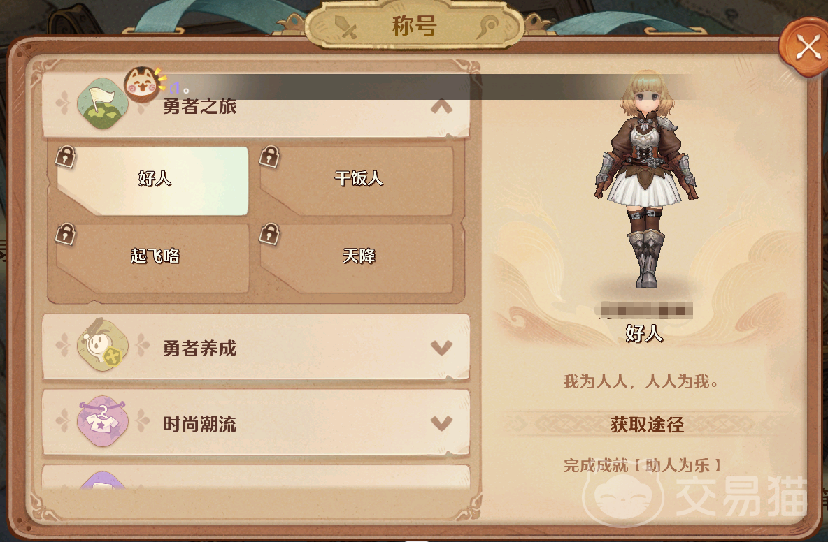 然后最后一个玩法就是称号相关的玩法,里面包括了冒险,养成,时尚等多个板块,每个版块中都有着不同的多个称号,这些称号基本都会与先前冒险笔记中提到的成就有关,称号本身能提供的作用十分有限,更多是作为一种装饰品浮现在角色身上,所以某种程度上来说它更像是一个奖励。