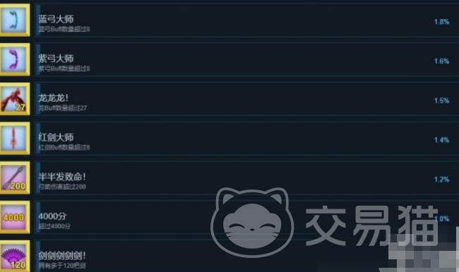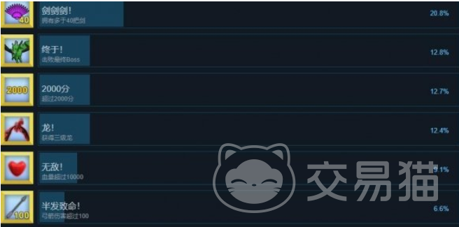 另外一个成就的设置更加简单,玩家在作为新手的时候就可以直接达成,比如第一句开始之后,玩家依靠走位顺利的让boss消耗掉自己的血量,血量丧失完毕之后,玩家就会游戏失败,而这一项成就也就达成了,除此之外,游戏中的成就都相对比较有挑战性,比如在游戏中拥有一百二十把剑,这需要玩家在游戏中不断日积月累才能达成。