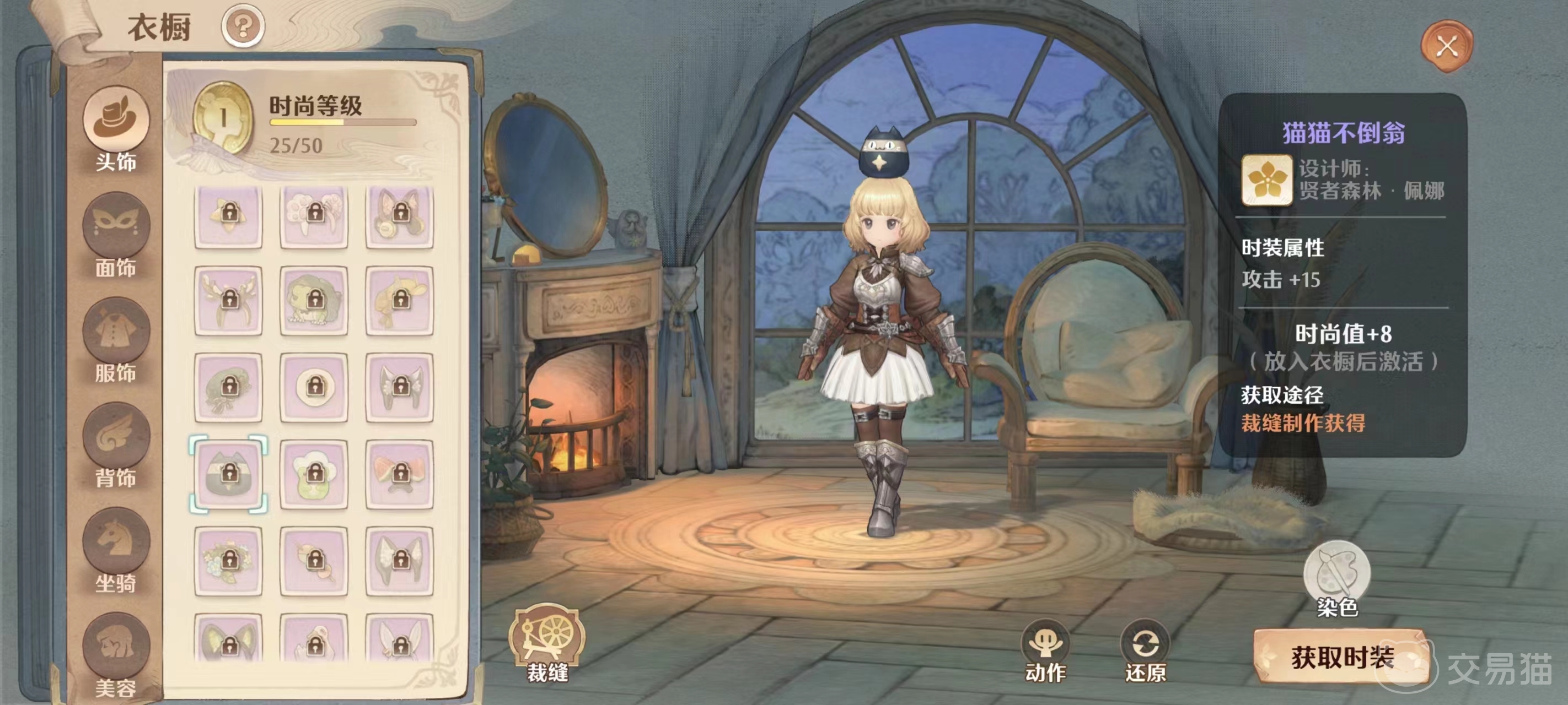 猫猫不倒翁是一个设计者出自贤者森林的紫色头饰,它在外形上名副其实,是一个小小的黑色猫形不倒翁,穿戴之后你可以获得八点时尚值和15点攻击,而如果想获取它那么只能通过裁缝制作。