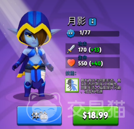 游戏中还有一个非常独特的人物就是月影,这个人物的外观和装饰都非常有代表性,而且这个人物算的上是游戏中的一个氪金人物,因为碎片收集起来比较困难,如果玩家想要尽快拥有这个生命值和攻击值都比较强大的英雄,那就可以通过氪金的方式迅速获得,在战斗过程中,这个角色有着比较强的攻击能力,而且每一个皮肤所带来的攻击力也都会有细微的差别。