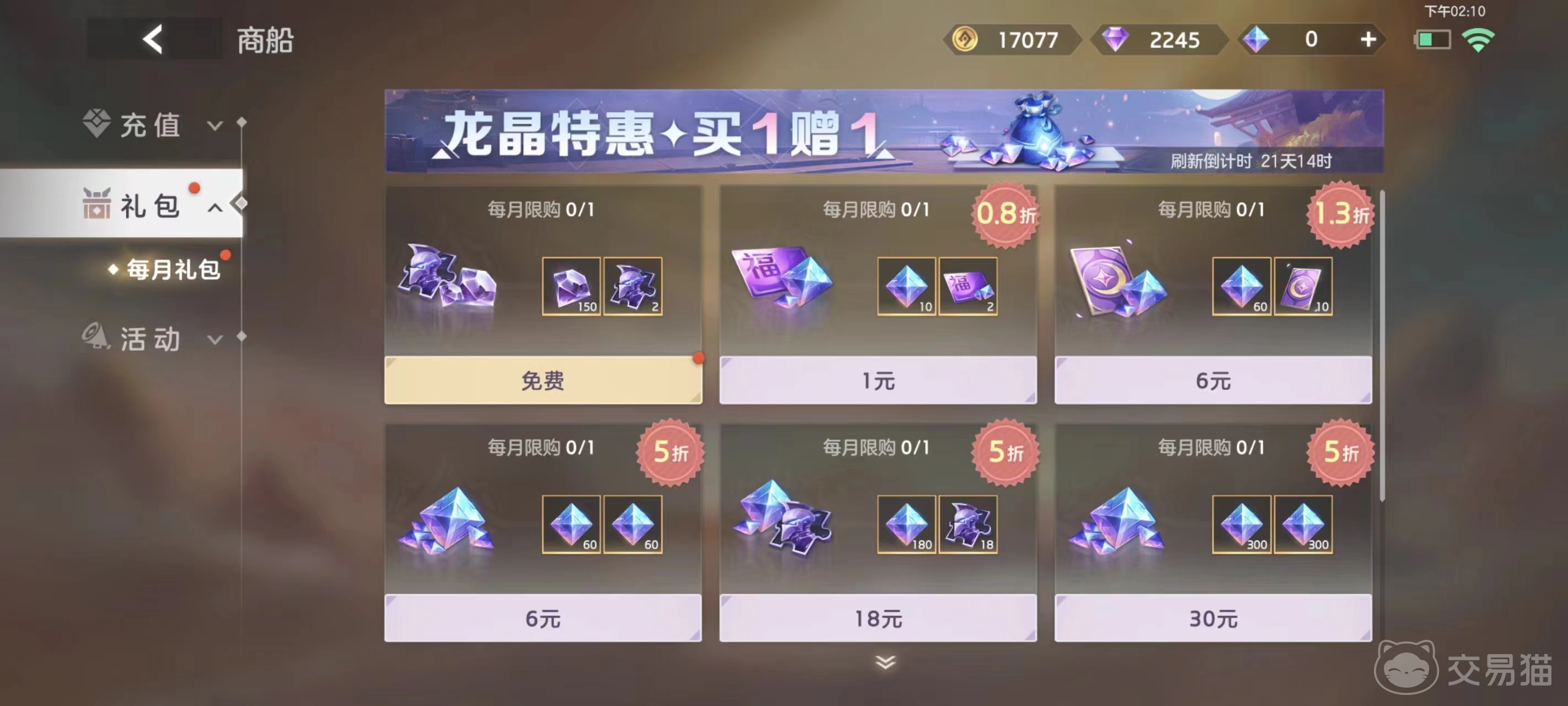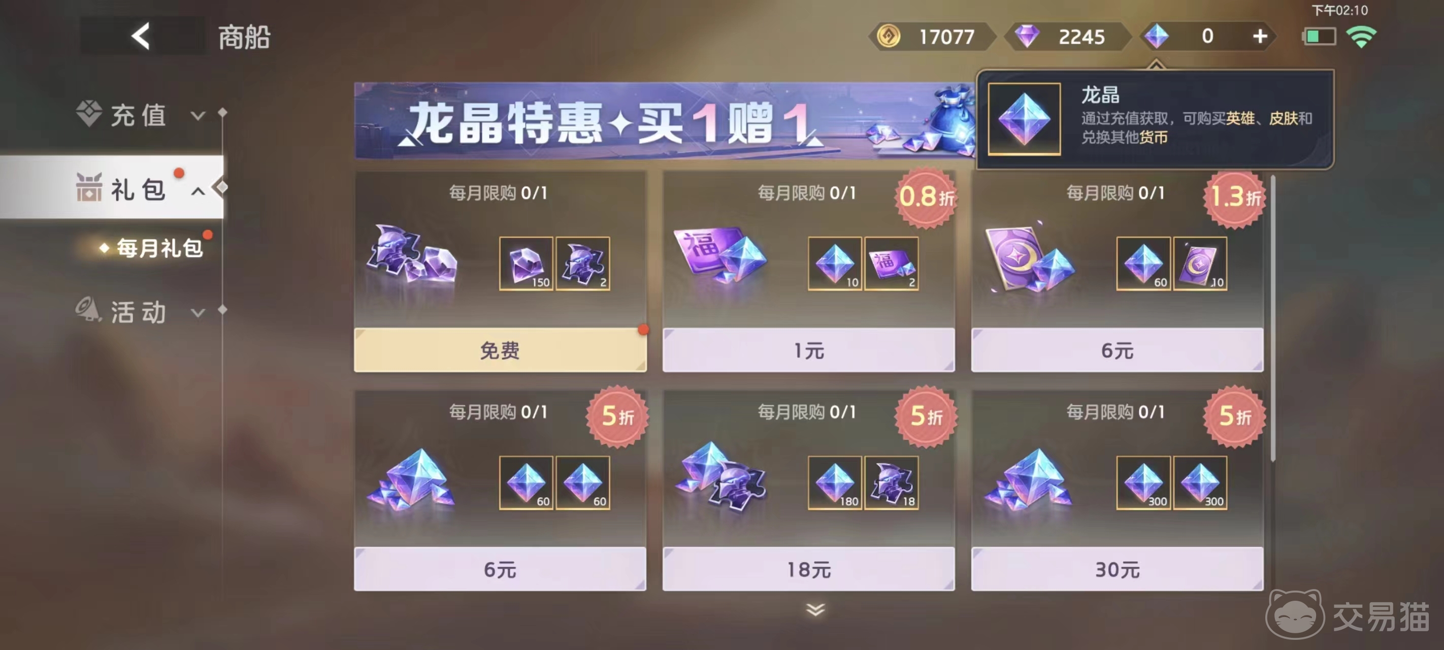 第一种方式是每月礼包,这种是获取龙晶性价比最高的一种方式,因为你花费原价之后除了能获得相同价值的龙晶以外,还能得到一些其他的奖励,包括祈福卡,寻宝签和英雄碎片等等,其中6元和30元个人感觉最划算,因为它直接给了双份龙晶,不过这种方式每月只有一次机会。