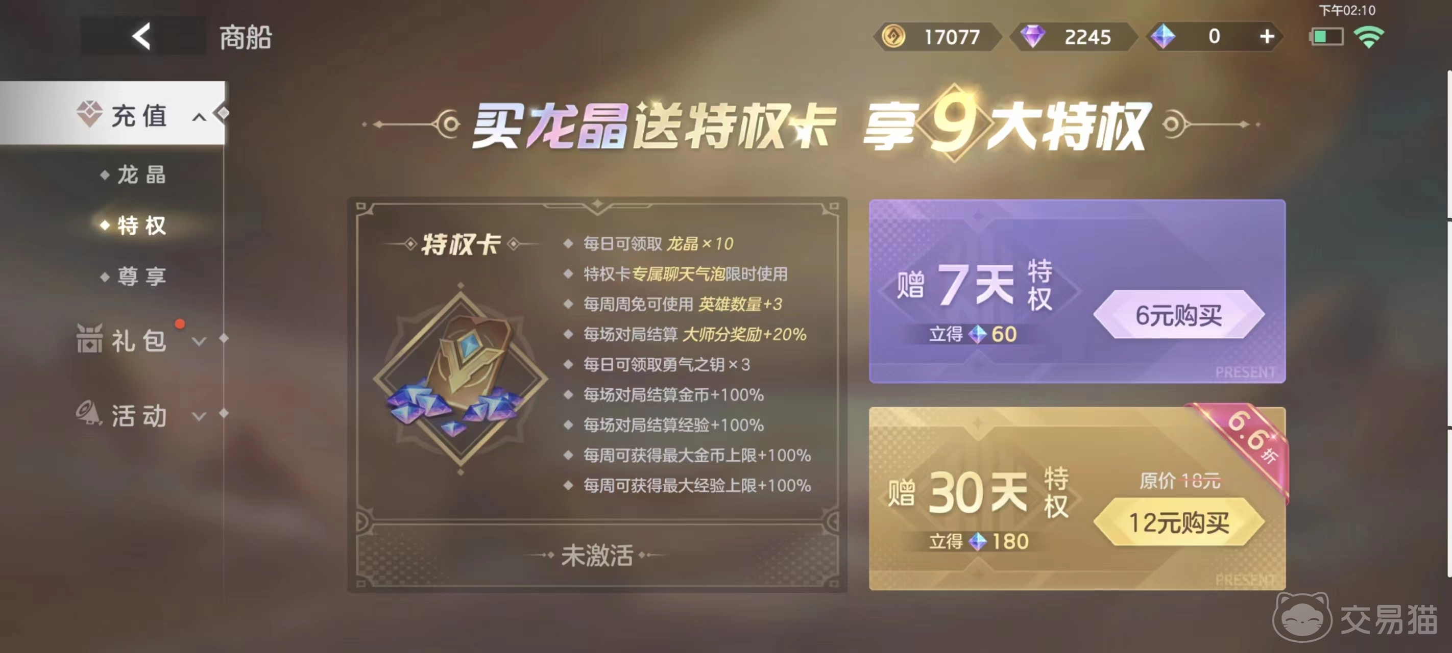 第二种就是购买特权卡,买下特权卡之后可以立刻获得同等数额的龙晶,另外后续每天还能额外领取十个龙晶,并且还有一系列的超值特权等待玩家享用。