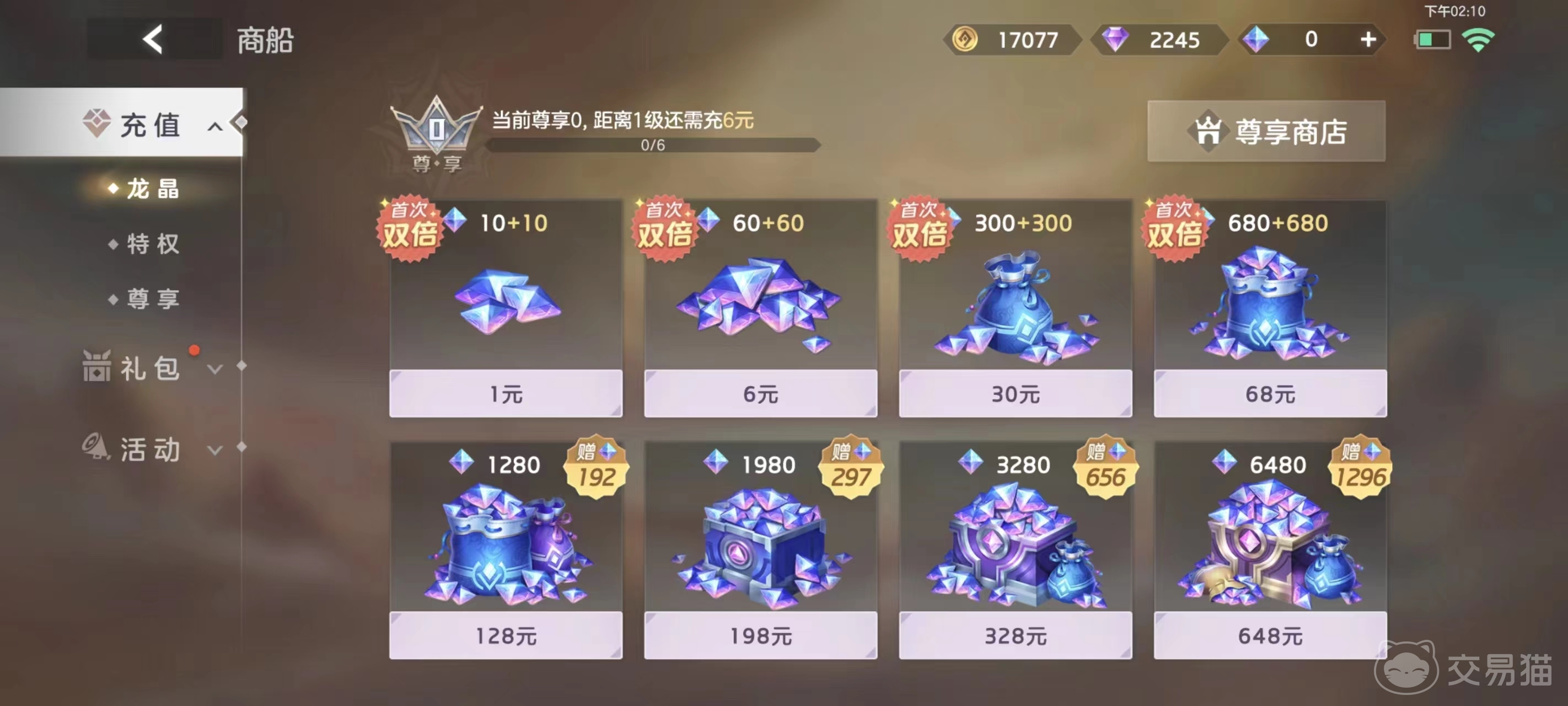 最后一种就是直充了,龙晶直充的比例是1元:10龙晶,不过首充的时候1~68元这四个档位都会有双倍福利,相当于半价拿下它们,不过到了128以上后,这个双倍福利就不存在的,但仍然会赠送少量额外的龙晶。