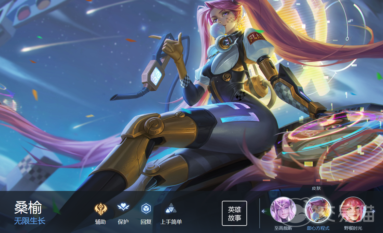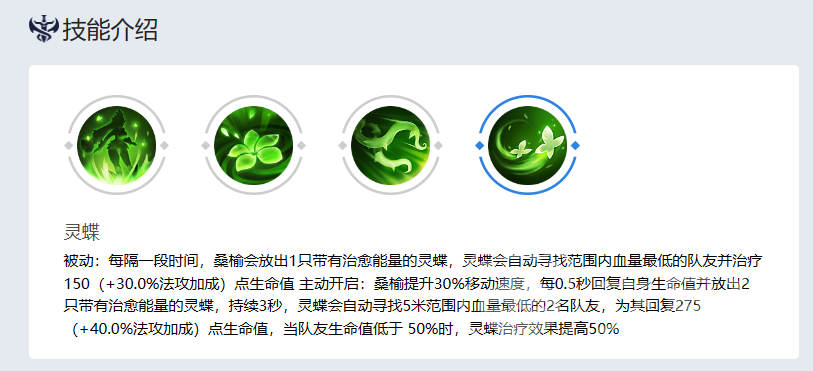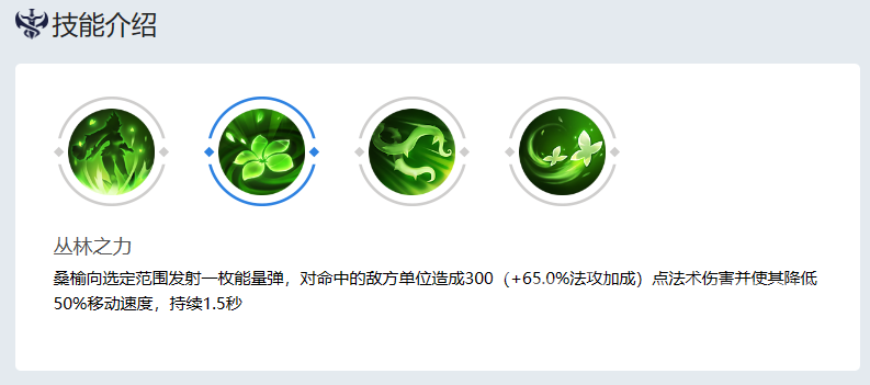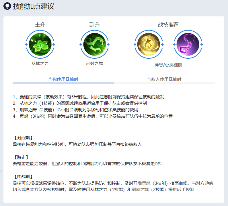 她的被动技让其当进入草丛时会获得移速和生命回复的增益buff效果,这让她在草丛中有很强的生存和机动能力。桑榆的一技能是丛林之力,她向指定区域发射一枚能量弹,造成法术伤害并减速敌人,这是她主要的消耗技能。桑榆的二技能是荊棘之舞,她放出一条藤蔓,沿直线前进并造成法术伤害,如果命中敌方英雄,则会禁锢他们一段时间,这是她主要的控制技能。桑榆的三技能是云蝶,这是一个被动加主动的技能。被动效果是一段时间后,会自动释放一个回血功能的云碟,并自动追随低血量友方英雄进行治疗。主动效果是桑榆开启后会在间隔0.5秒就恢复自身HP并额外召唤两只云蝶,持续3秒,这两只云碟会为他们回复更多的生命值。这是她最重要的治疗技能。