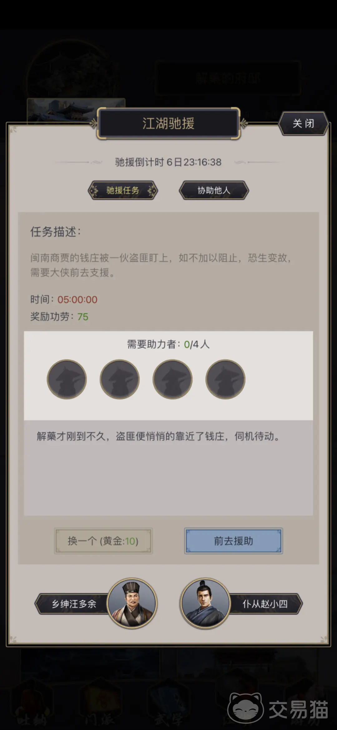 同时在外出游历的时候也会获得不同地图任务中的江湖驰援令,但是这个概率是比较低的,玩家们如果前期没有多余的黄金,那么可以选择去完成日常任务,在达成最终任务点就可以获得一个江湖驰援令!