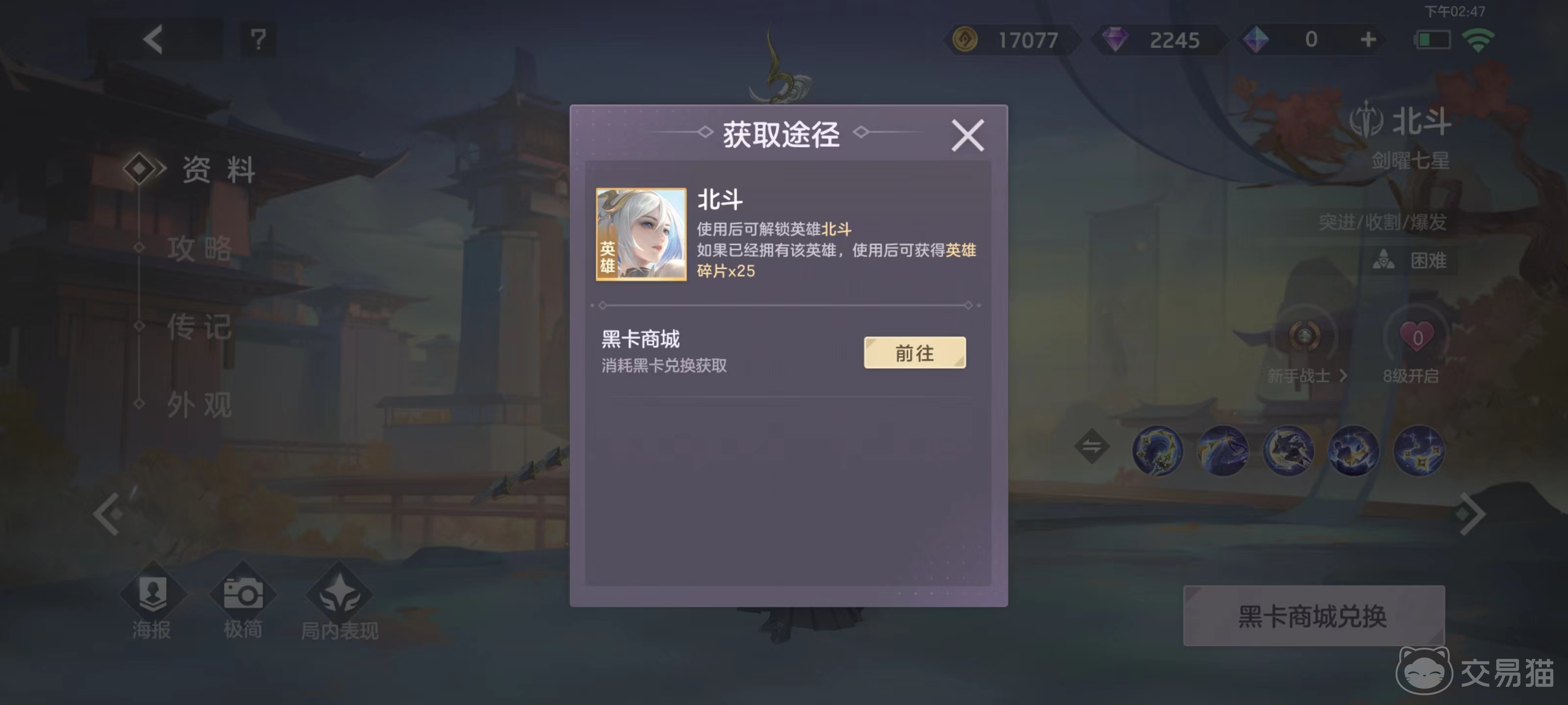 想要获取北斗的话目前还只能通过黑卡商城兑换获取,这个黑卡它是属于冠军联赛的一种奖品,该联赛云集了游戏内的各路高手,想要获取的话那你得首先保证自己的实力过硬,北斗在其中的价格其实已经算是比较便宜。