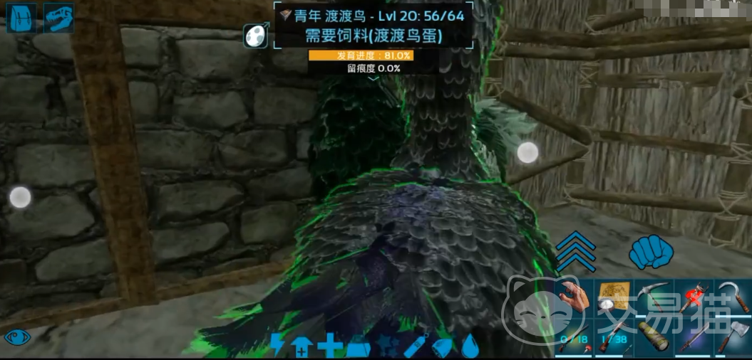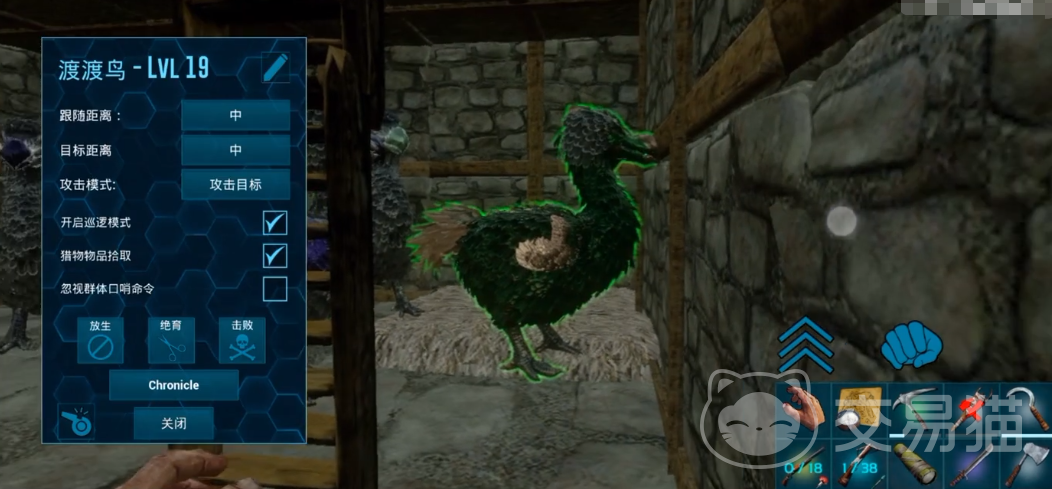 回到自己领地之后需要建造一个喂养的地方,可以用栅栏围起来一块地方,随后将公的跟母的放在一起养,然后左上角的巡逻模式打开就可以啦,后面母渡渡鸟就会生蛋,这些蛋大家放在篝火堆比较温暖的地方进行过孵化,这样养殖就成功啦。