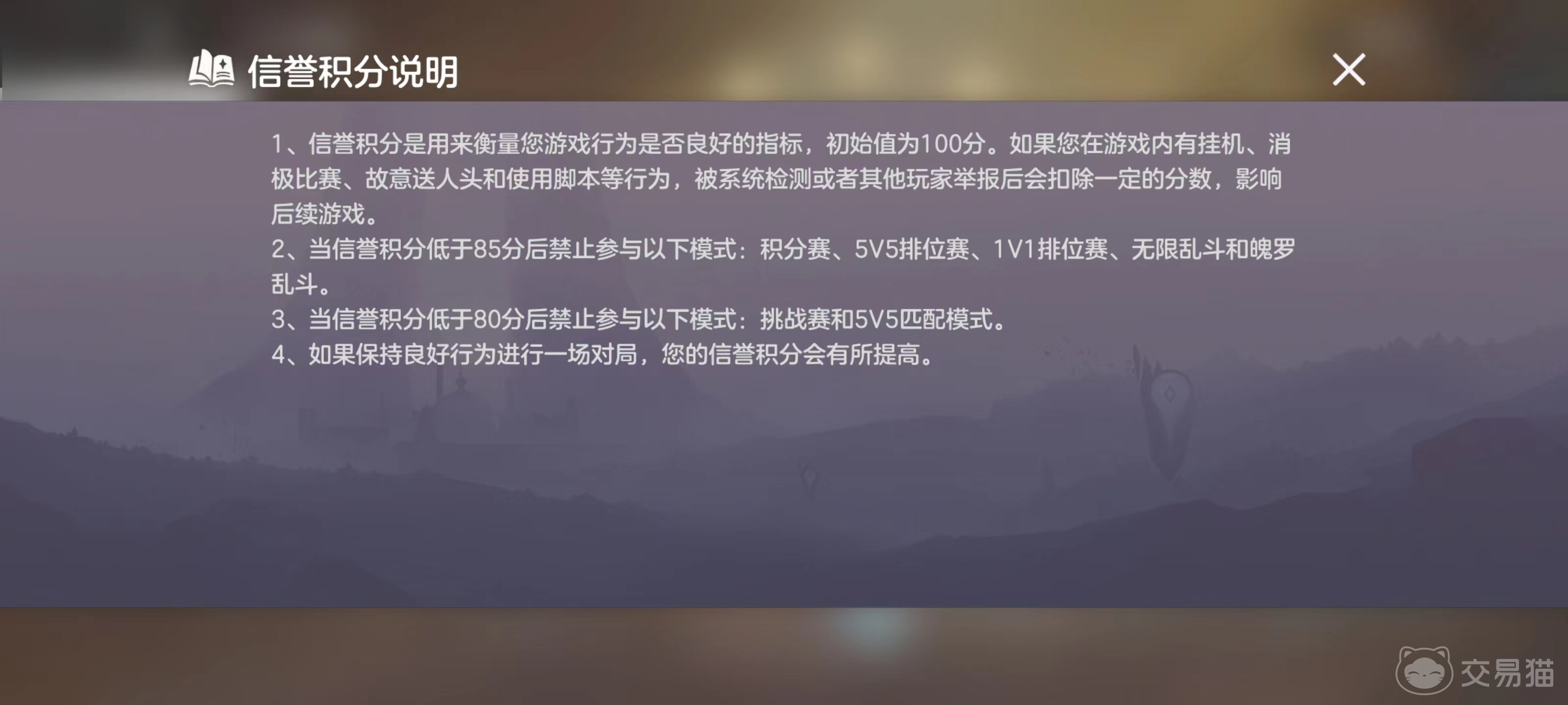 除了系统检测更为严格,还有其他玩家举报的因素在里面,另外85信誉分和80信誉分都是一个分水岭,前者会让你没法参与主流的对战模式,包括排位赛,乱斗等等,而80分之后基本上所有pvp模式都打不了了,那个时候就只能去打人机或者等过一段时间自动恢复信誉分了。